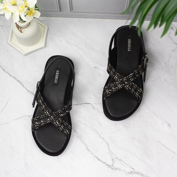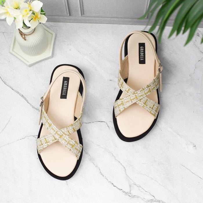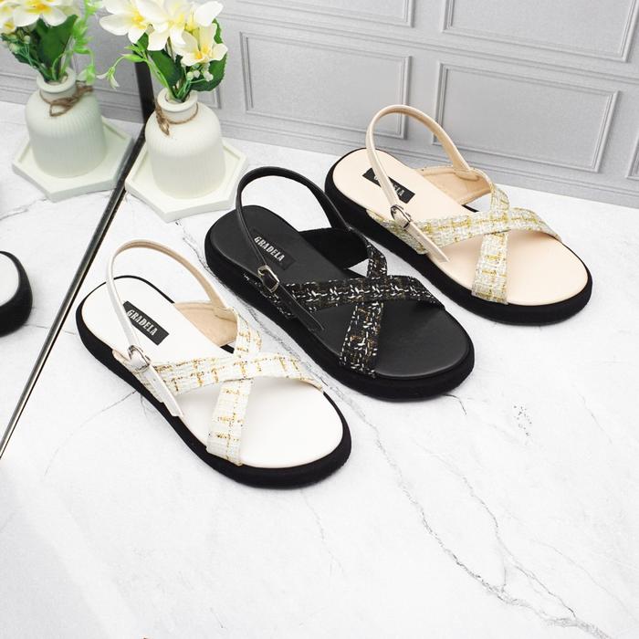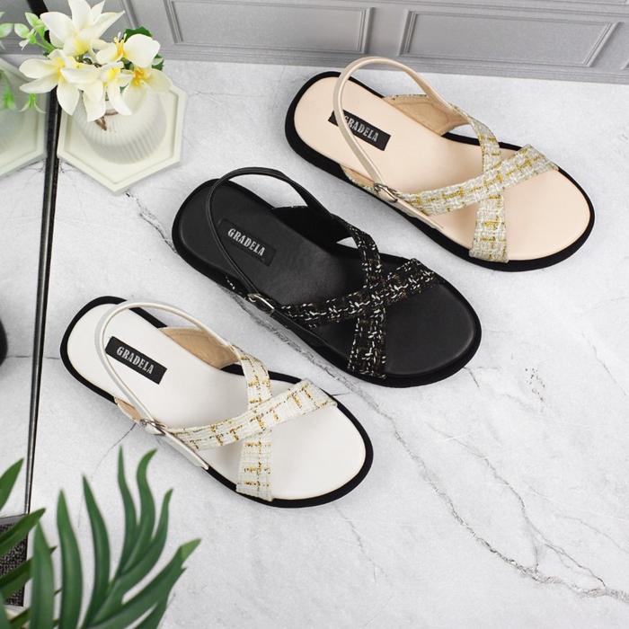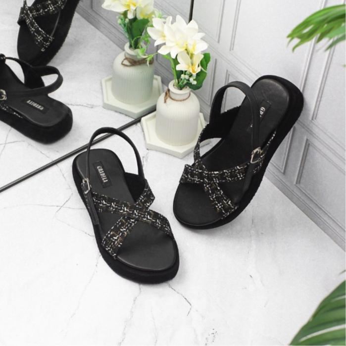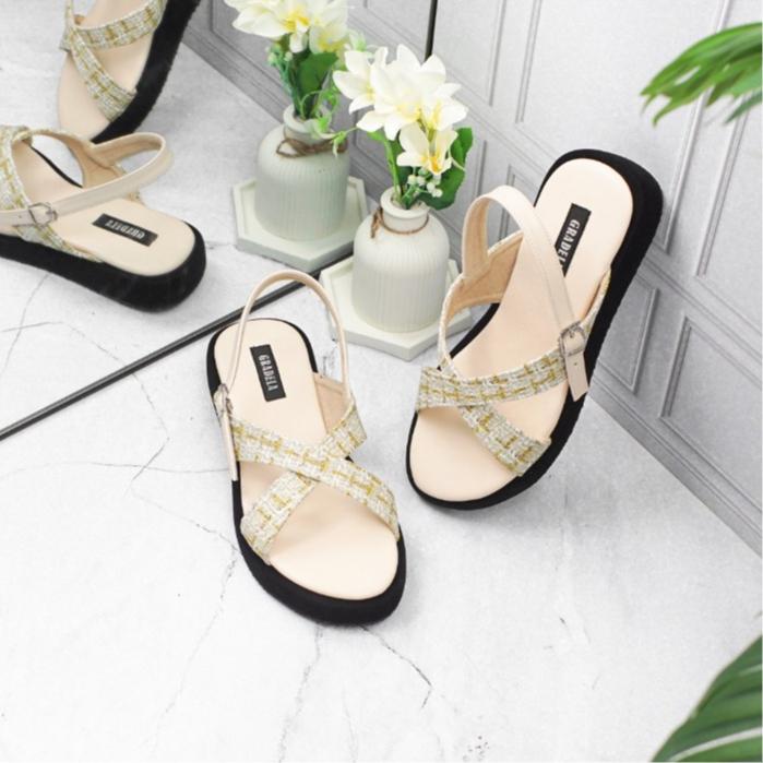 GRADELA - ZAHRA SANDAL TALI PLATFORM WANITA SENDAL MOTIF KAIN TWEED CEWEK - CREAM, 36