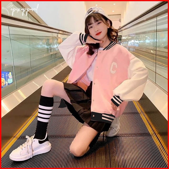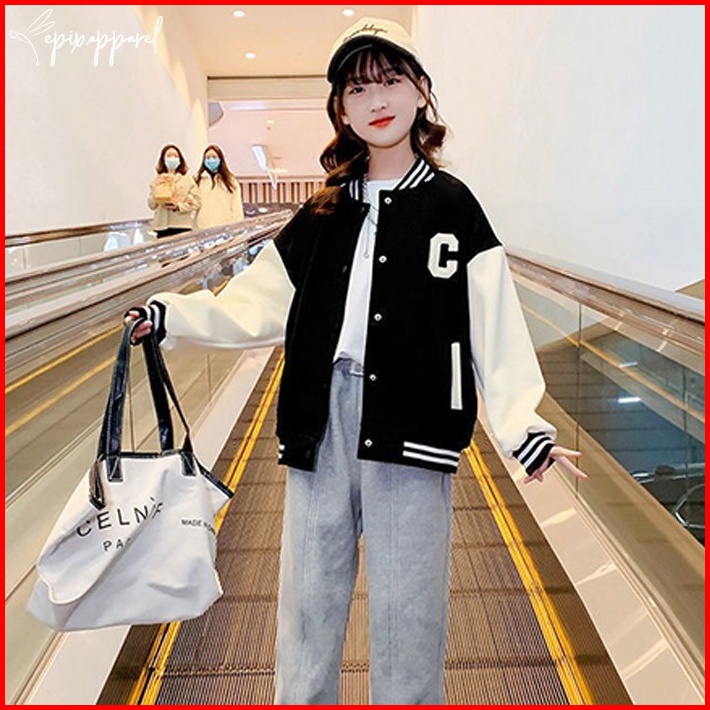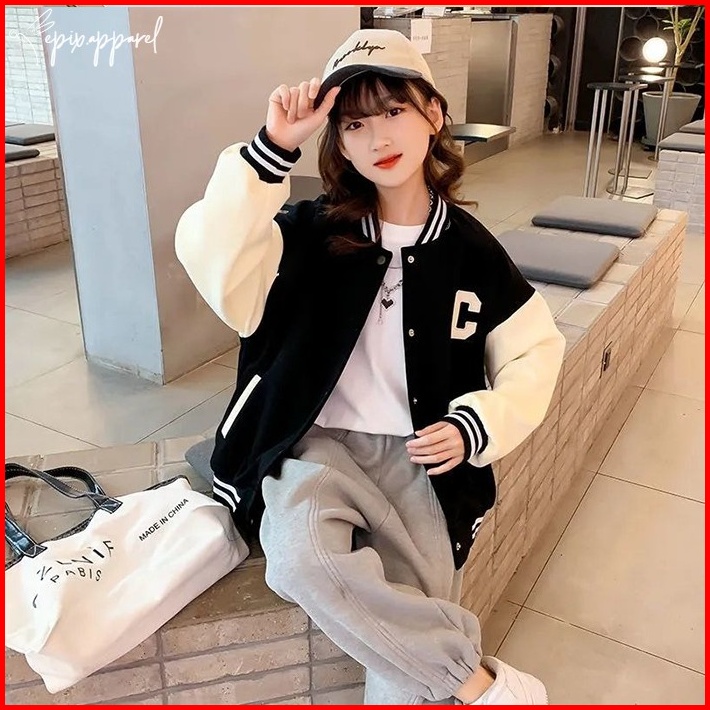Jaket Anak Baseball Bomber Perempuan Laki Laki Hitam Beige Pink Umur 2 4 6 8 10 12 14 16 Tahun Model Huruf C Premium Bah