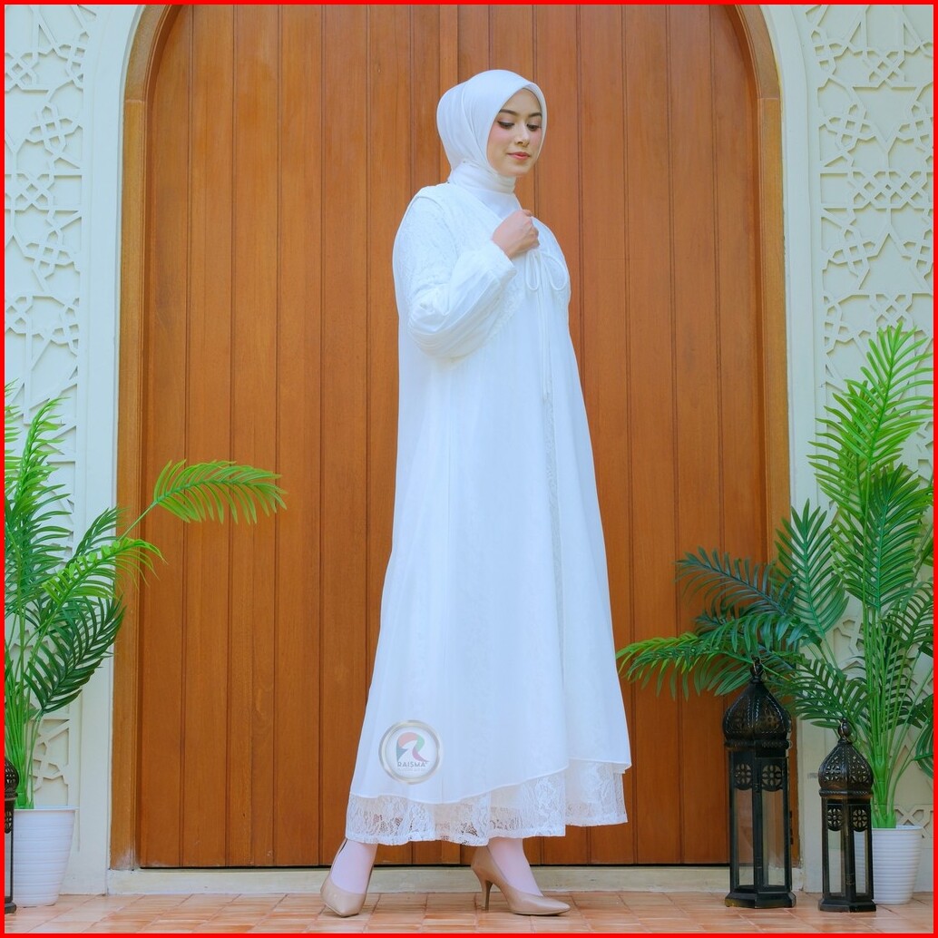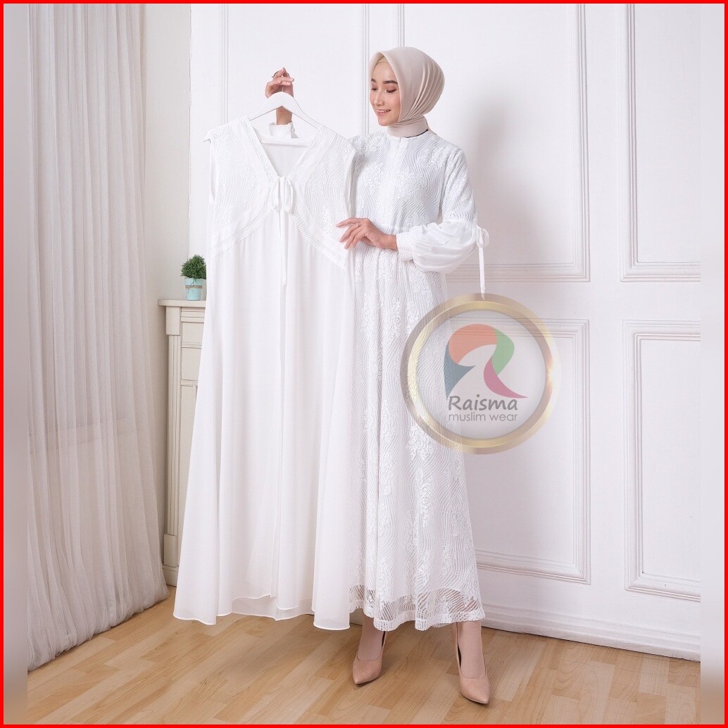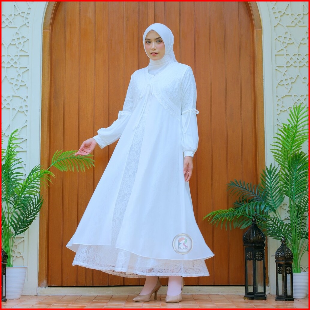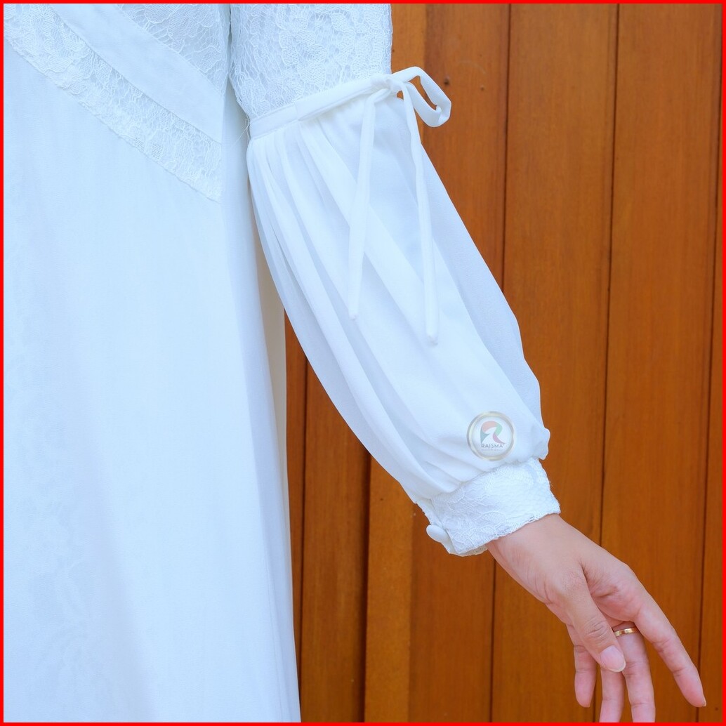 Raisma Gamis Putih Tulang Lebaran Cantik Dan Elegan Kombinasi Brokat Dan Ceruti Layla