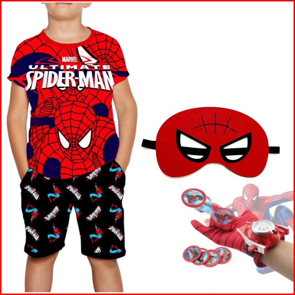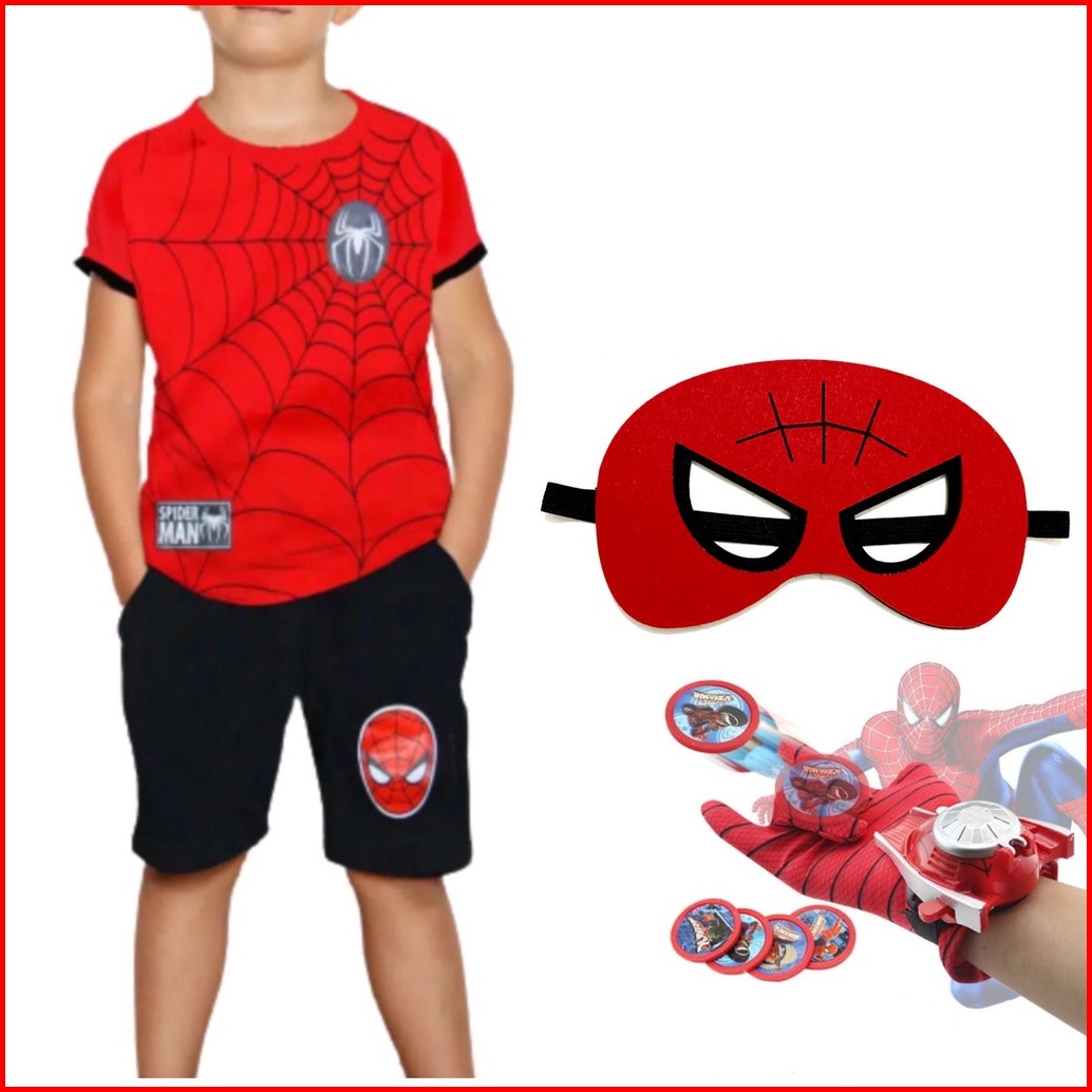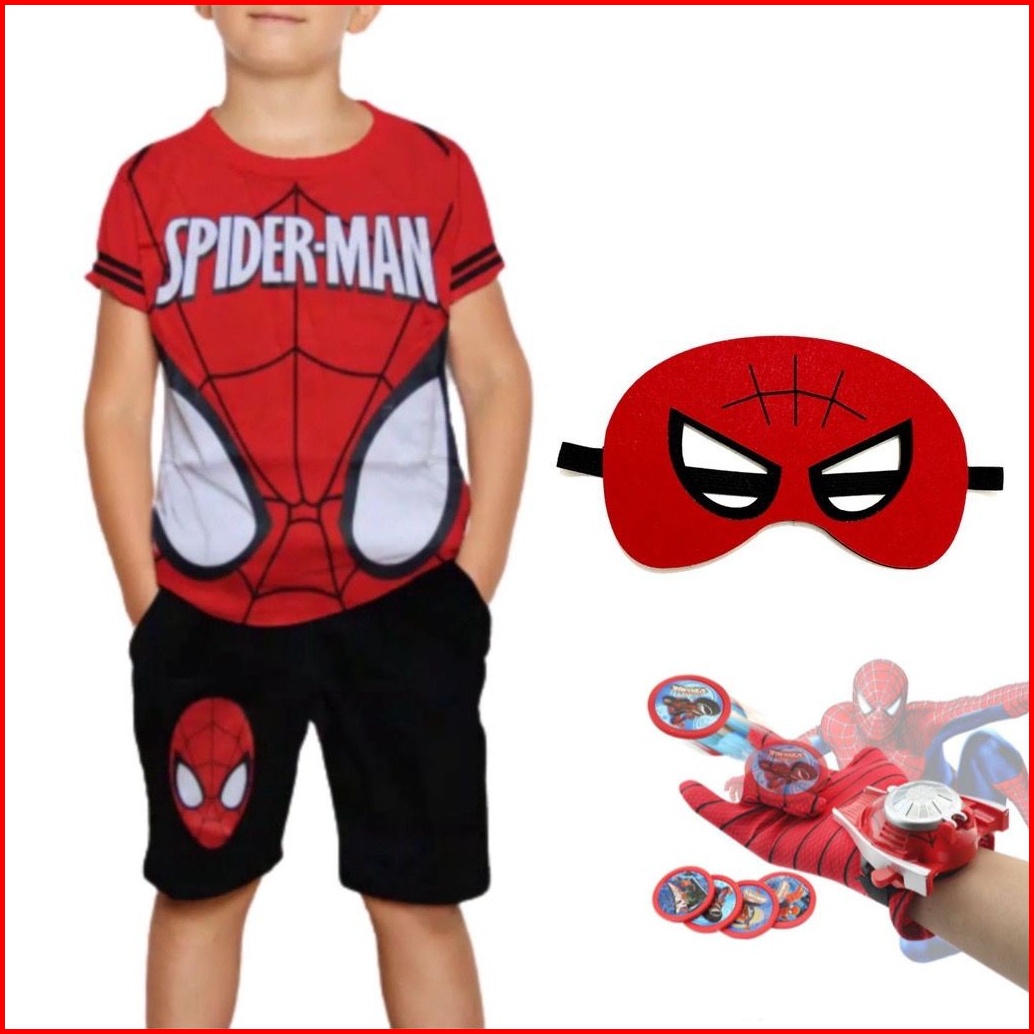 Stelan Pendek Anak Laki-laki Baju Spidermen Lengkap Dengan Topeng Dan Mainan Sarung Tembak Spaidermen
