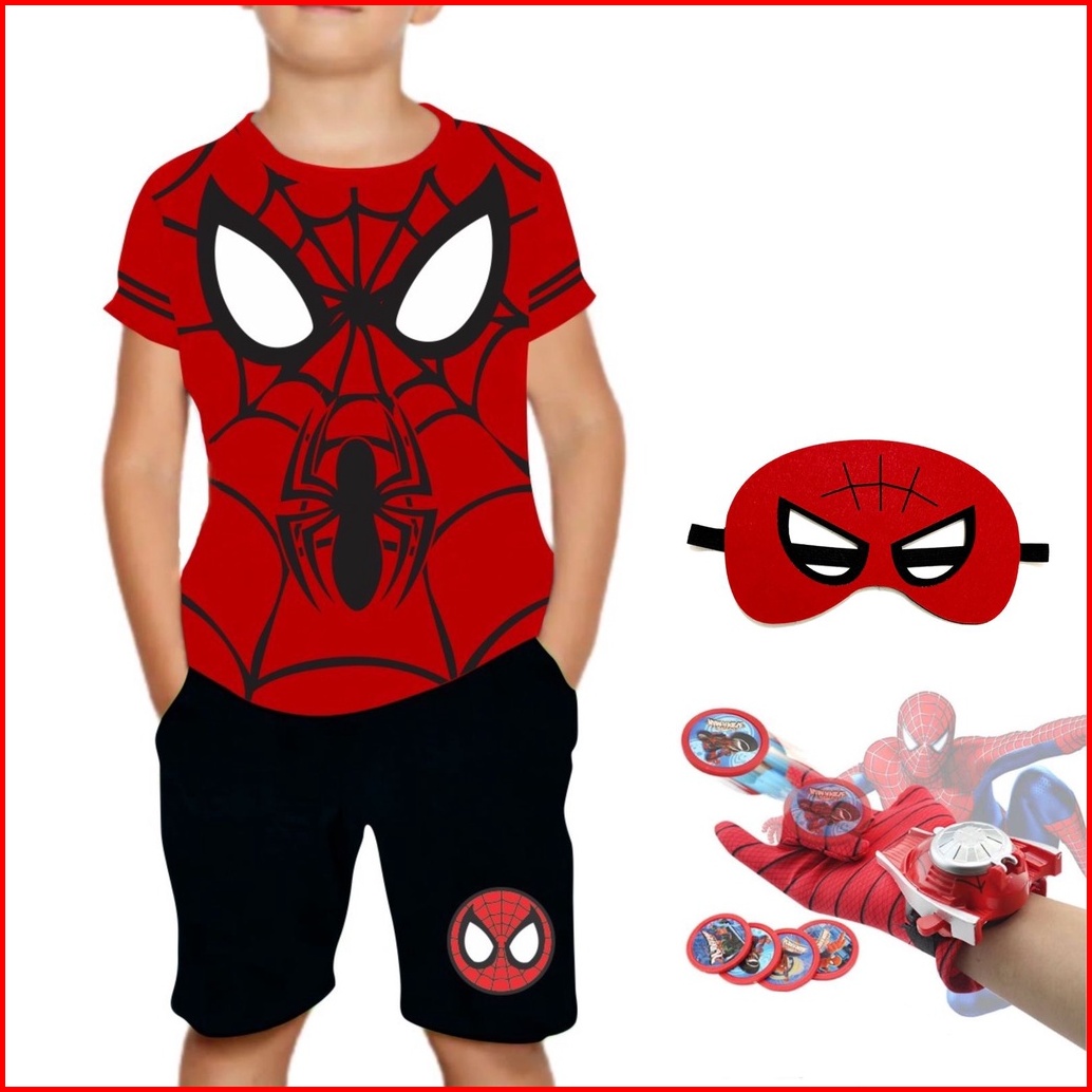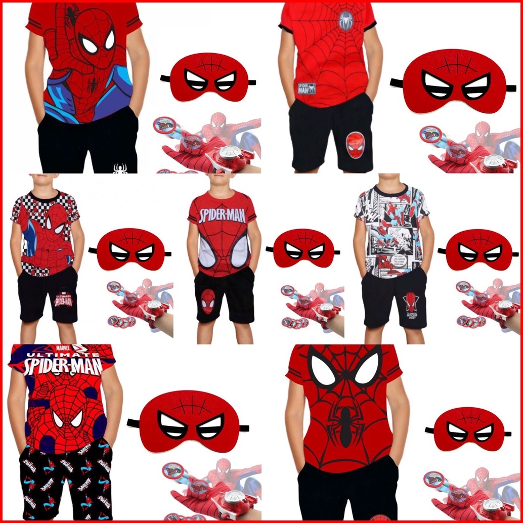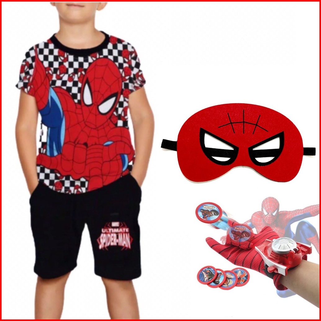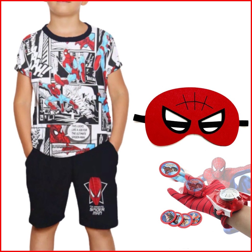 Stelan Pendek Anak Laki-laki Baju Spidermen Lengkap Dengan Topeng Dan Mainan Sarung Tembak Spaidermen