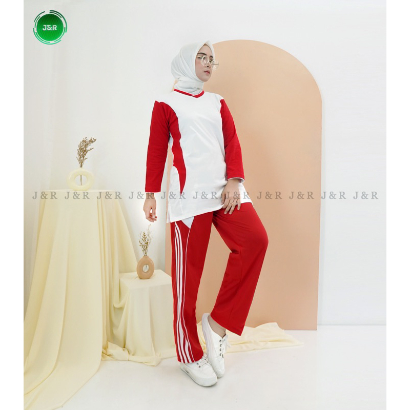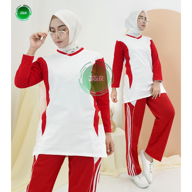 BAJU SENAM WANITA TERBARU SETELAN BAJU TUNIK MERAH PUTIH KATUN NYAMAN AGUSTUSAN BAJU MERAH PUTIH