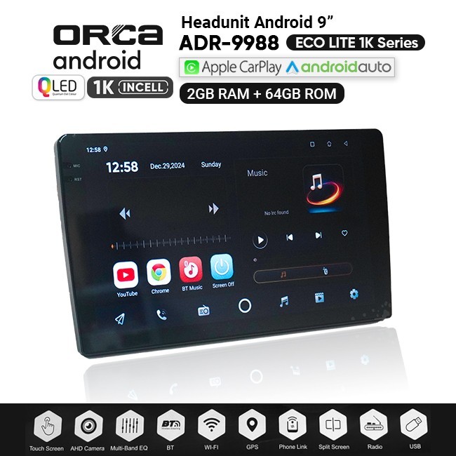 Headunit Android Orca Eco Lite Series QLED 1K INCELL CarPlay 9 Inch Ram 2/64