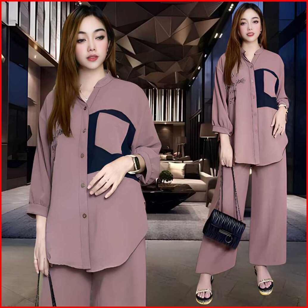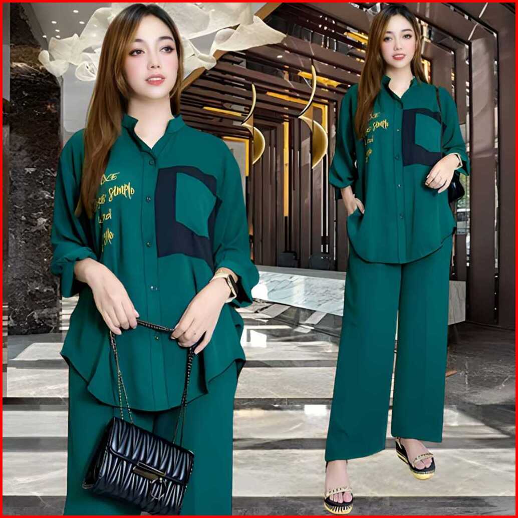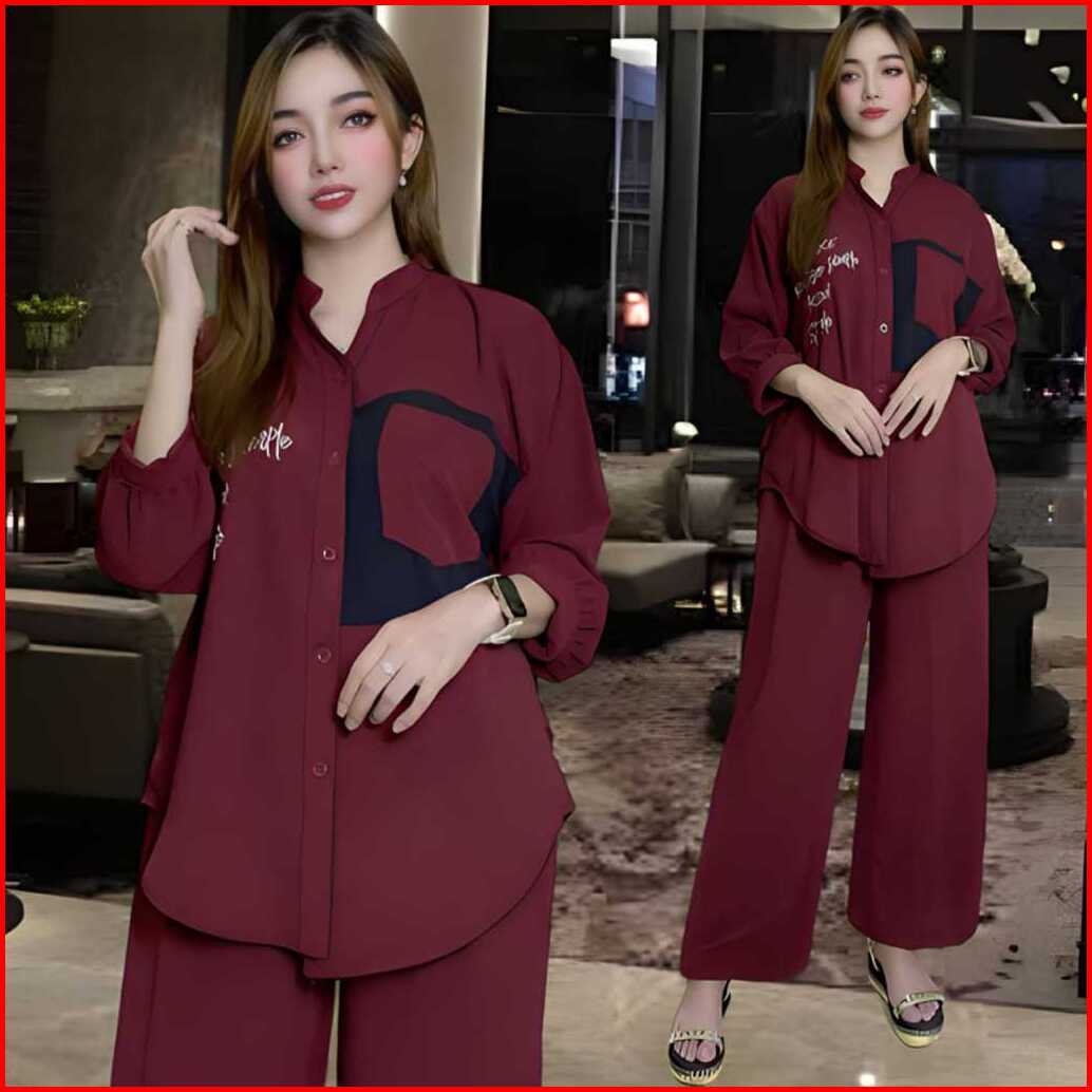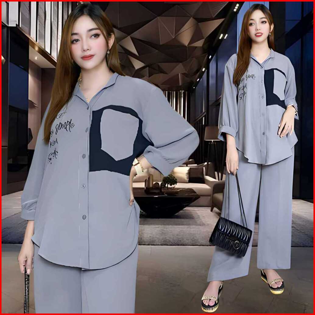 Elea Setelan Crincle Wanita Kekinian Ld 120 Atasan Kemeja Oval Celana Lurus Bahan Crincle Airflow