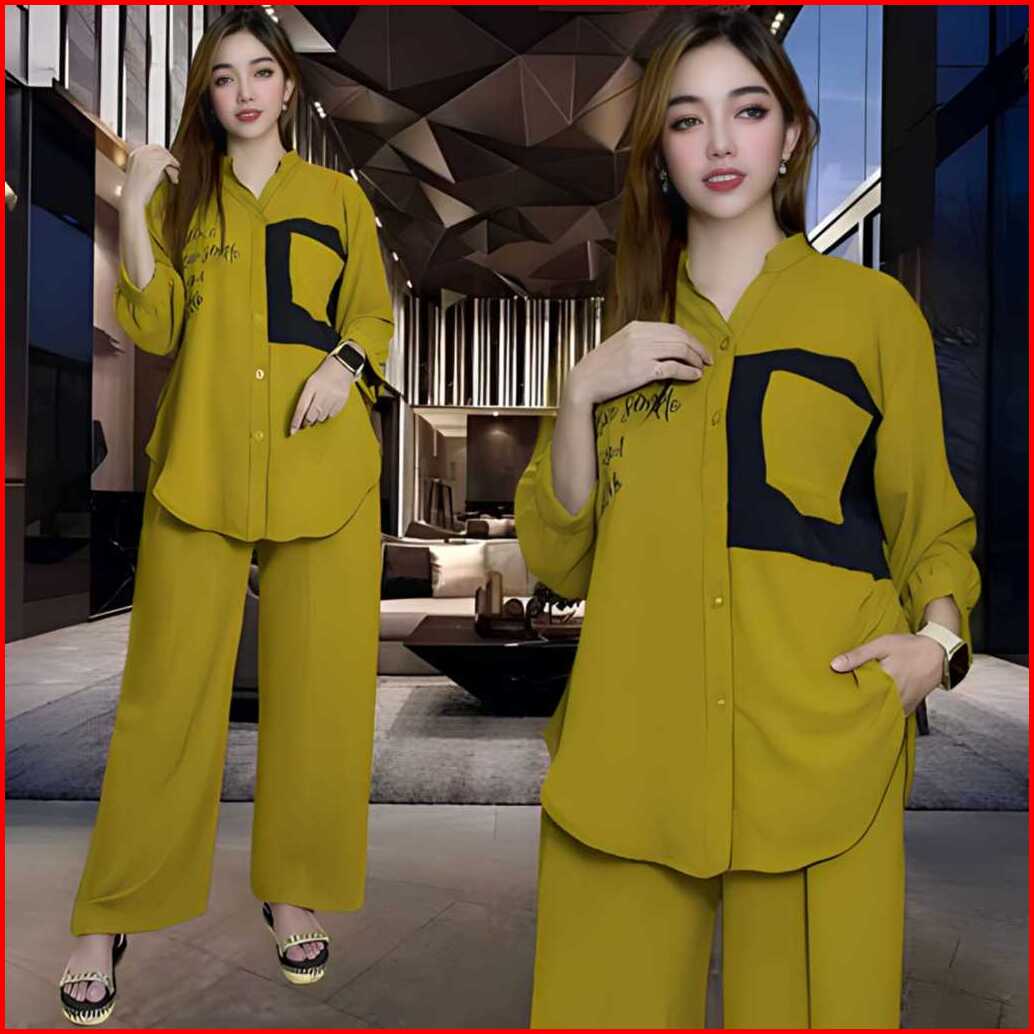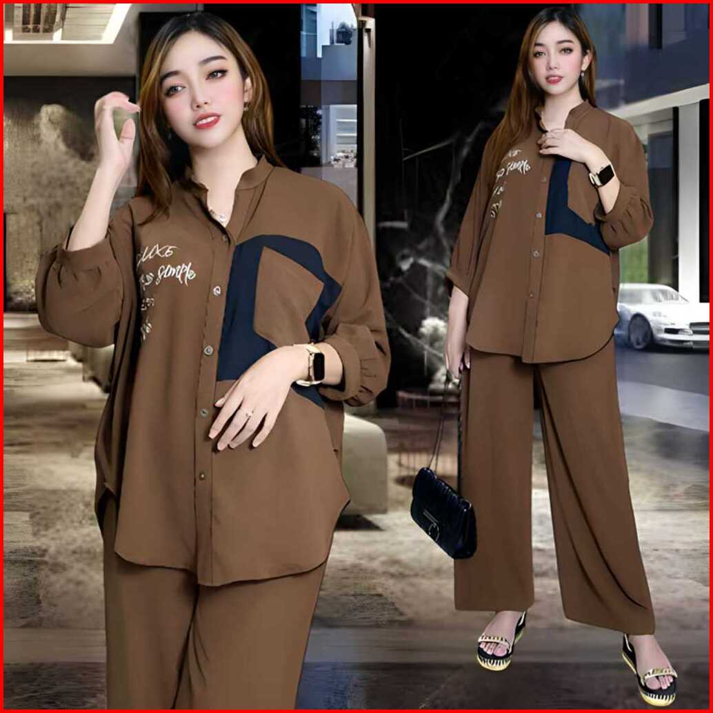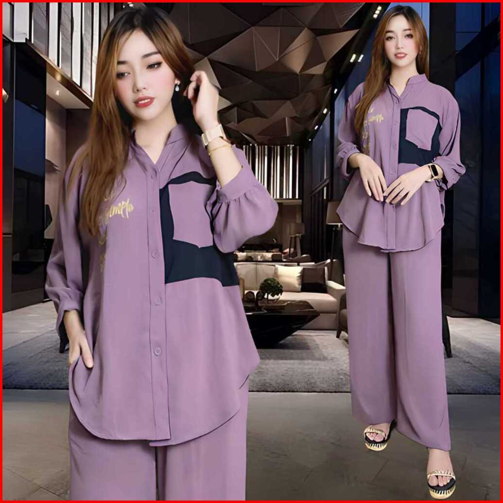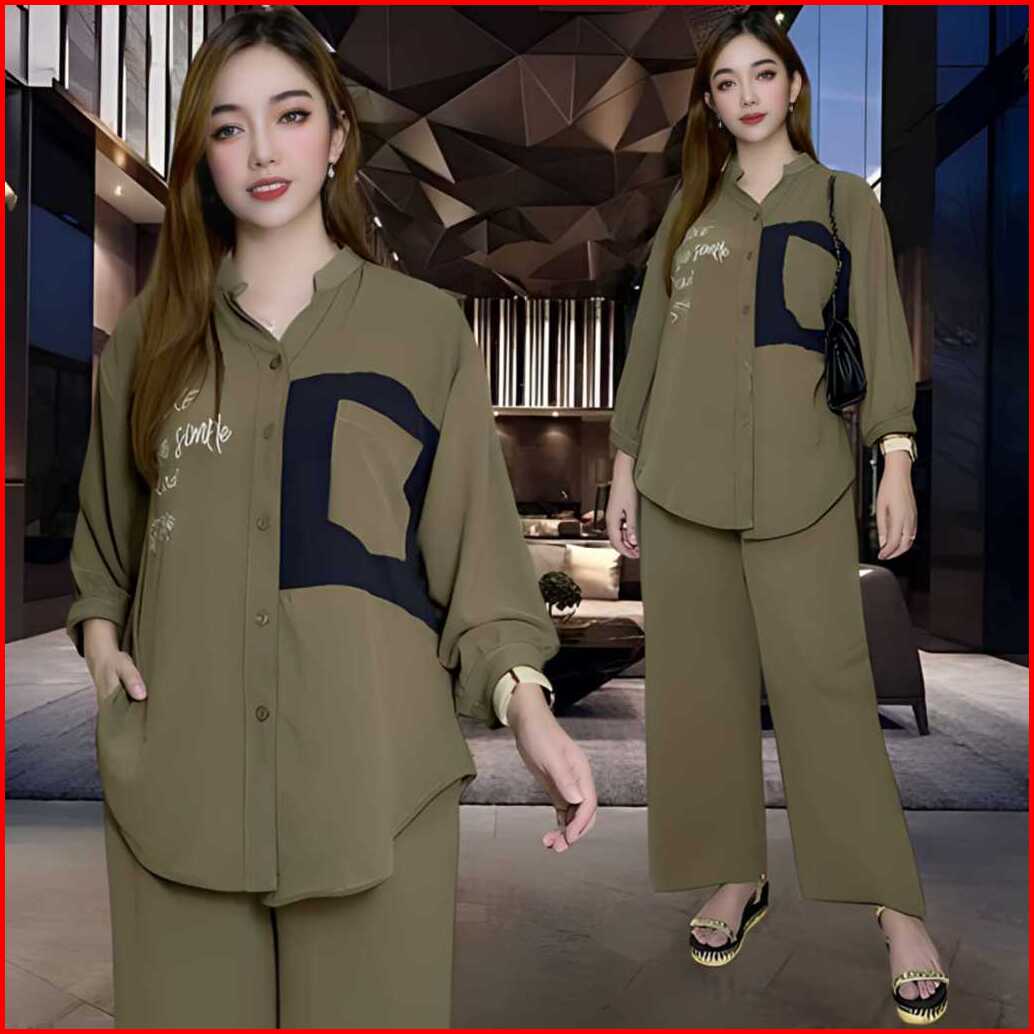 Elea Setelan Crincle Wanita Kekinian Ld 120 Atasan Kemeja Oval Celana Lurus Bahan Crincle Airflow