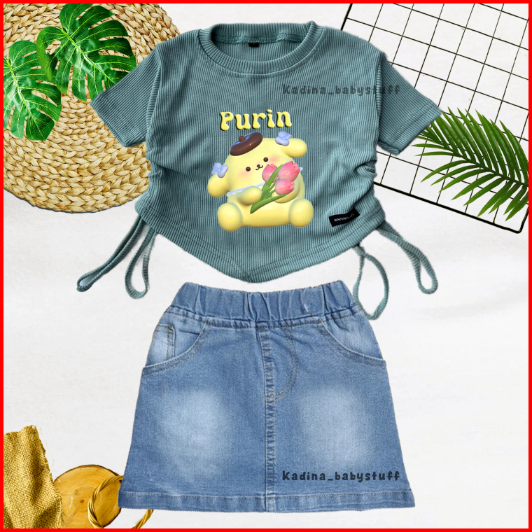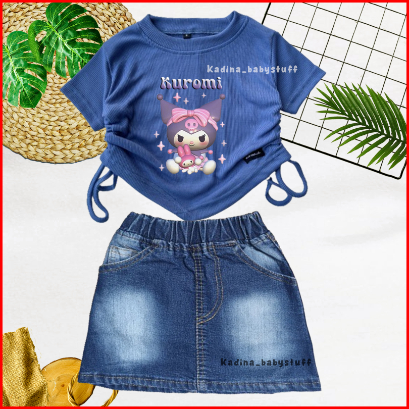 Setelan Anak Perempuan Rok Pendek Jeans Sand Wash Croptop Motif Sablon Karakter Lucu Anak Usia 1-8 Tahun