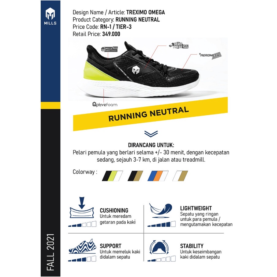 SEPATU LARI MILLS TREXIMO OMEGA SEPATU RUNNING SHOES Black/Grey/White/Neon/Black White ORIGINAL RANK SPORTS 9100113