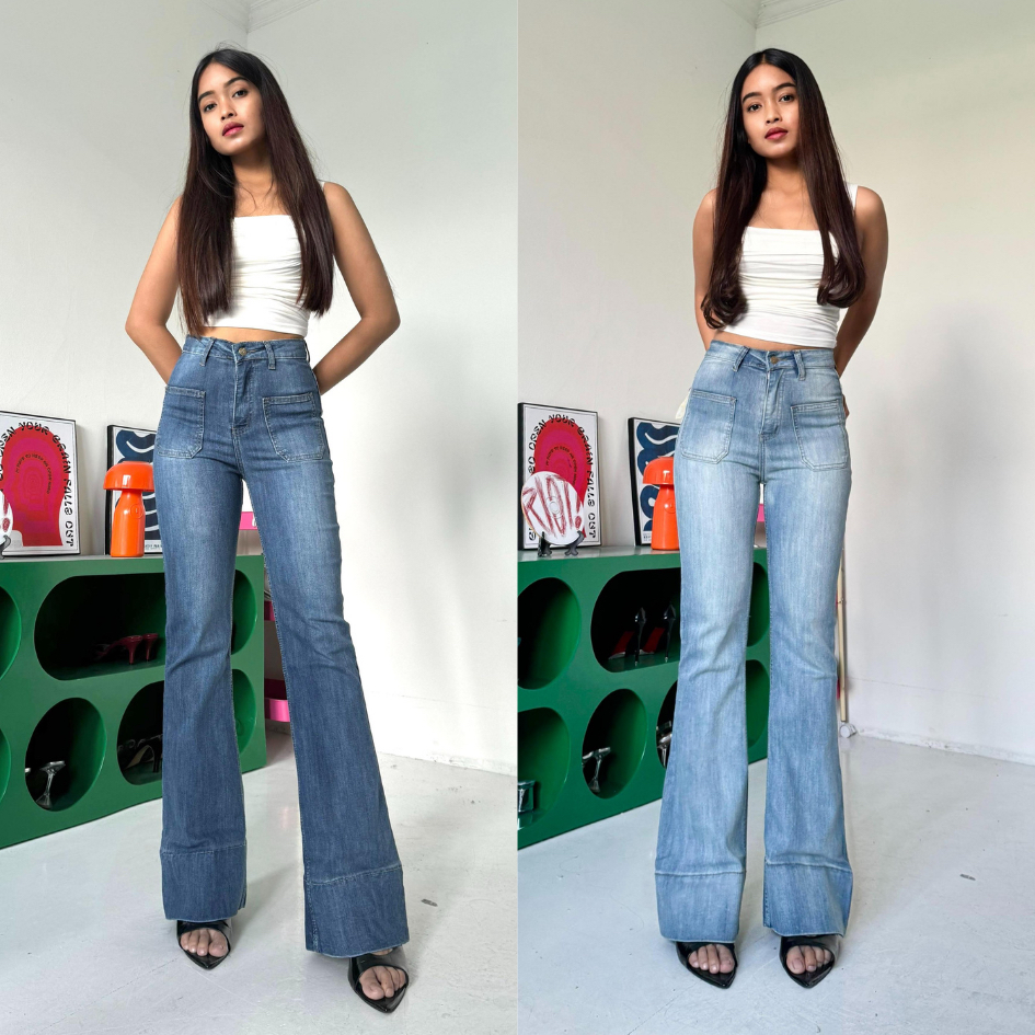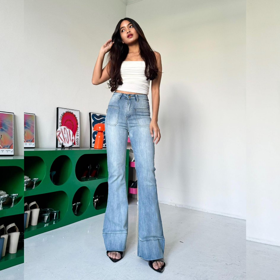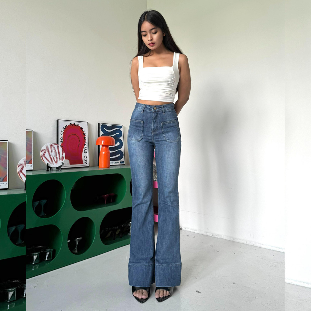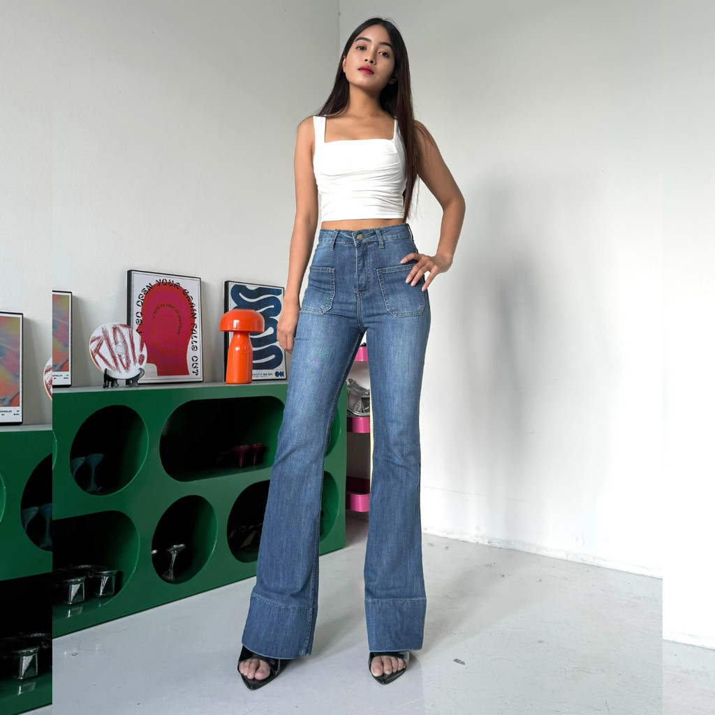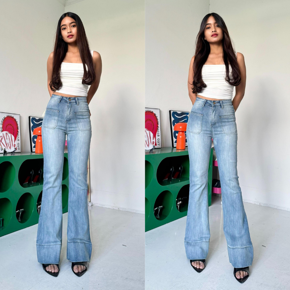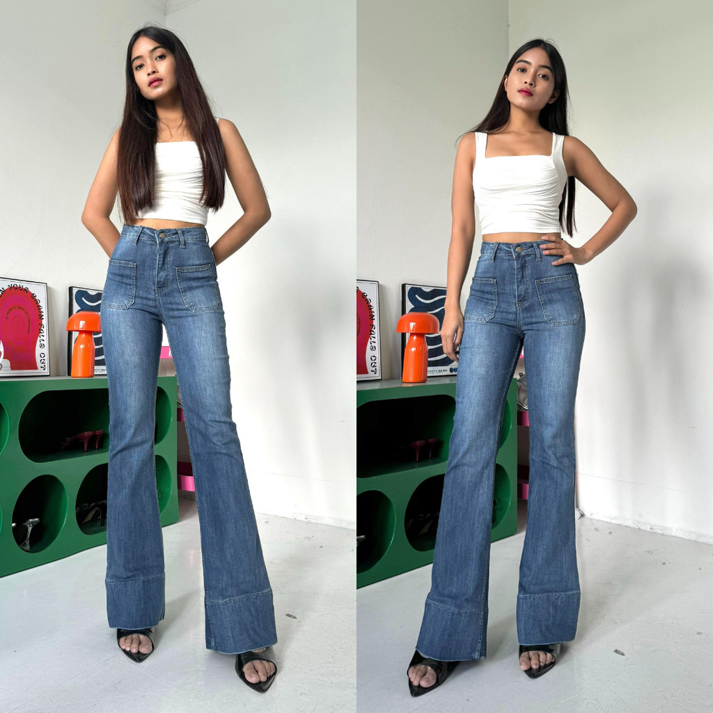 LADOUCE - Kelly High Waist Cutbray Jeans Celana Stretch Flare Panjang Wanita