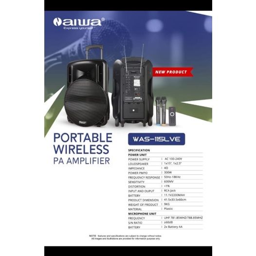Speaker Portable AIWA WAS 115LVE WAS 115 LVE 15inch USB-BLUETOOTH
