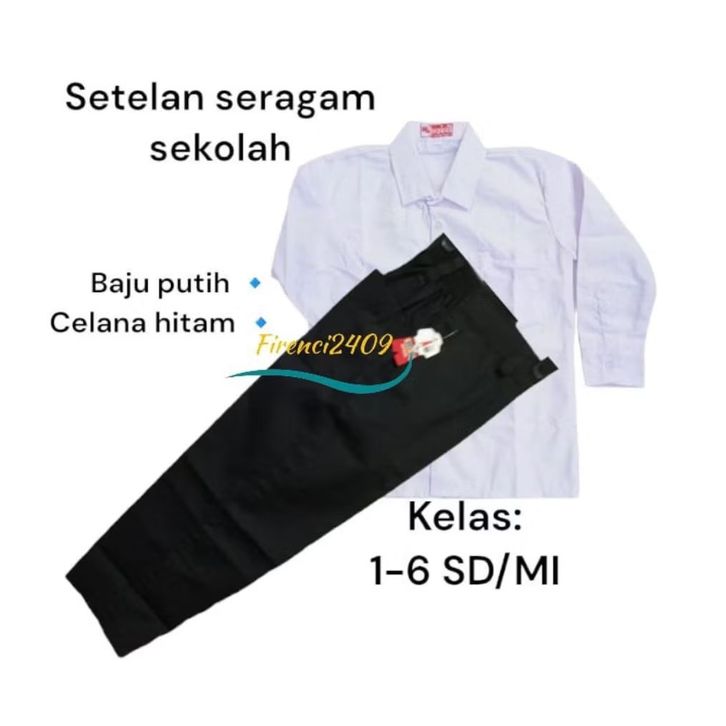 Setelan seragam sekolah MI /SD hitam putih setelan usia 6-12 tahun baju panjang polos celana panjang