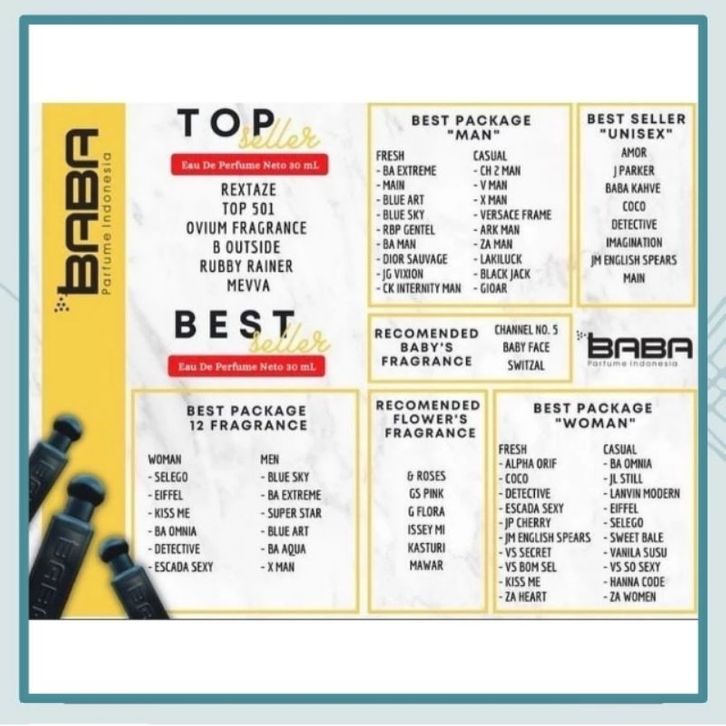AIGNER DEBUT, AQUA DE GI0/RBP GENT, AignerBlack/BlackJac, Alpard Ori flame, AnasuiSCret/HanaCode, Angel Heart Button, Annasui Sweat Dream, ArianaGrande/ Arande, AskThink / Ayu Ting2, Avril KISS N ROSE, Avril Lavigne, BA EXTREAM, BLACK IN, BLACK OVIUM, BUBBLEGUM, BULGARY OMNIA, Baccarat Top 501, Blue Emotion/BlueArt, Bulbery London, Bulgary Aqua /BA Man, Bulgary Rose, CK BEE / SWEET BEE, COKLAT, COLD MAN / ICE COOL, CR 7 PLATINUM, CRIDIOR SAUVAGE, Chanel Coco, Cuddle Baby Face, DUNHIL BLUE SKY, Detective, ESCADA CHERRY, Escada Taj Mahal, Escada sexy Gravity, Ferrari Black, Fulman, Giorgio Armani, Gucci Flora, HANA GLAMOUR, HONEY MOON, HUGGO ENERGY, HUGO BOSS ORANGE, IMAGINATION, IMPERIAL, INSHINE, ISSEY MIYAKE, ITS Me, JAGUAR VIXION, JELLO STILL, JLO PLATINUM, Jaguar Black, Jesica Parker, Joe Malone, KASTURI, KISS ME, L Blue, LACOST, LIFEBOUY, LOVE ME, LUCKY LUCK, LUX, MAIN / MAHERZEIN, MELON, MEVA, MIKA PINK, MODERN L, Monte Bianco, NAGITA SLAV /AZZURA, ONE WAY, PC 1 MILLION, Paris Hilton / Eifel, REXTASE, RUBY RAINER, SAKURA, SCANDALS, SELEGO, SILVER, SOFT, SUNMORI, SUPER STAR / RAFFI, SWEET BALE, SWEET COKLAT, Sweet Rose, TISSUE, V Man / Ariel Noah, VANILA LACE, VANILLA, VCTORIA SECRET SCENT, VS SECREAT ROMAN WIS, VV MAN / VERSACE, Vanilla Susu, Victoria Bomshel, WHITE MUSK, WINTER /OLLA RAMLAN, Women Ice, X Mood, X Moon/ Sparkle moon, X POST, X WOMAN, ZARA LOVE, ZARA MAN