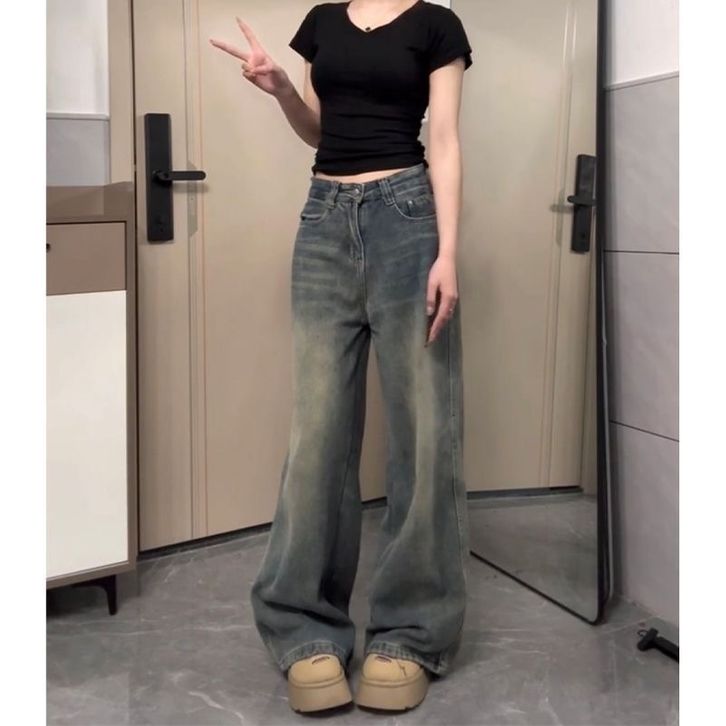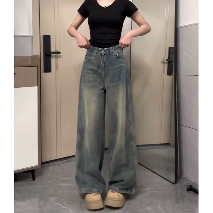 TERBARU YOYO - Premium Celana Jeans Wanita Biru Retro High waist Baggy Loose Jeans Kekinian Korean Style enibs