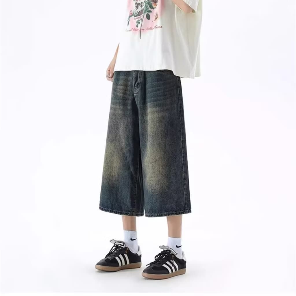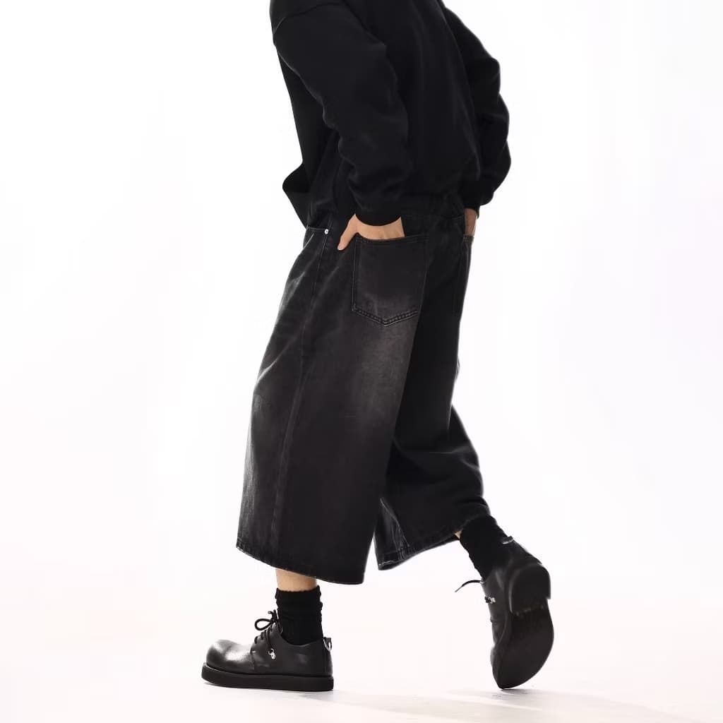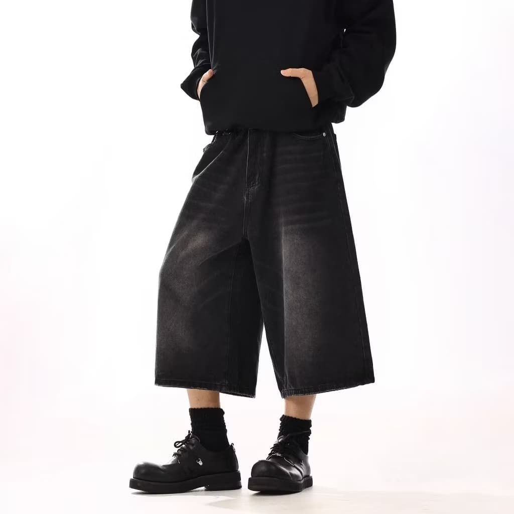 Celana Baggy Short Jeans Unisex Pria Wanita Celana Gombrong 7/8 Black Retro