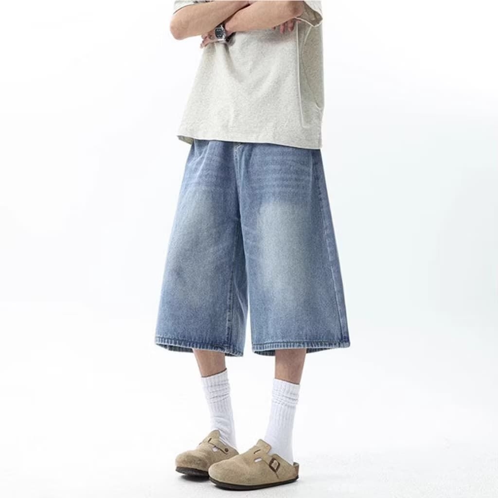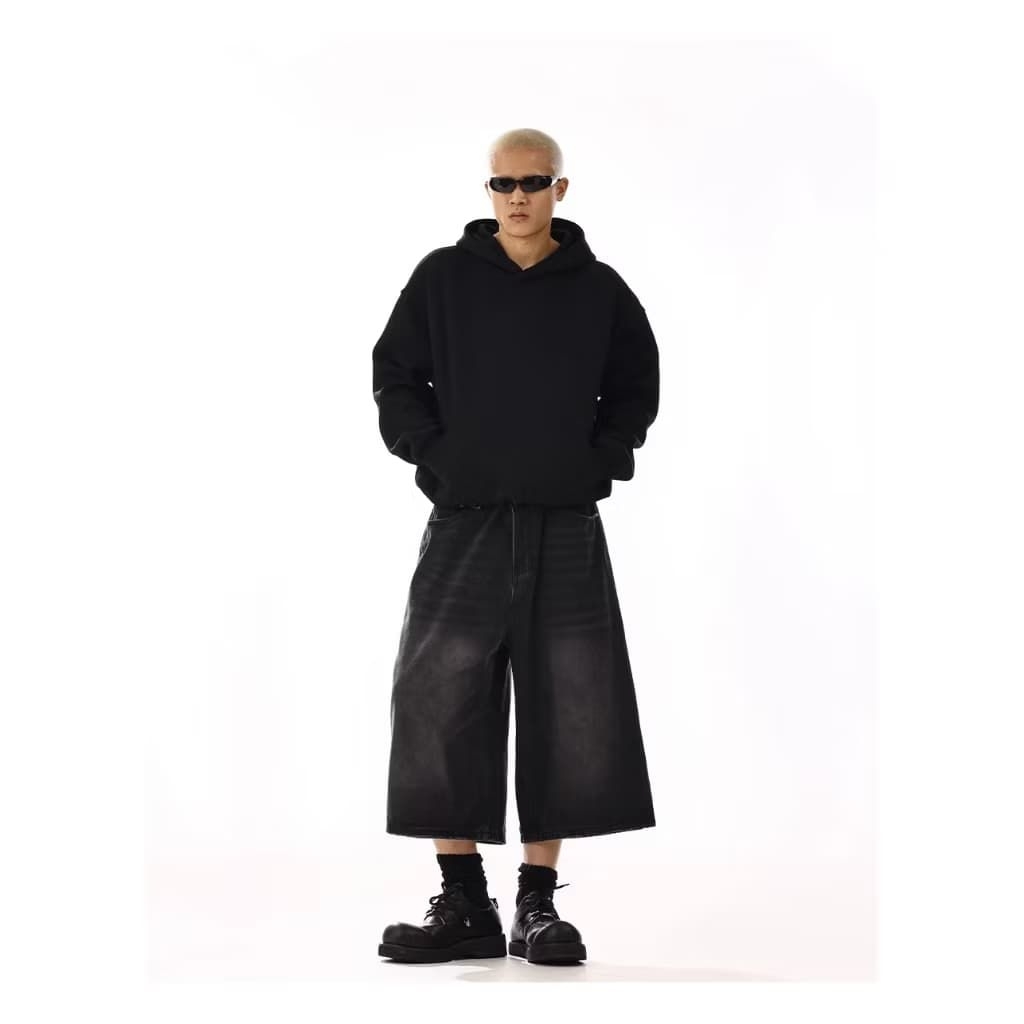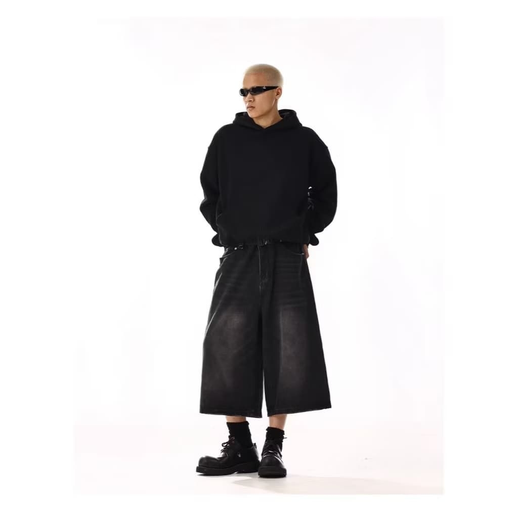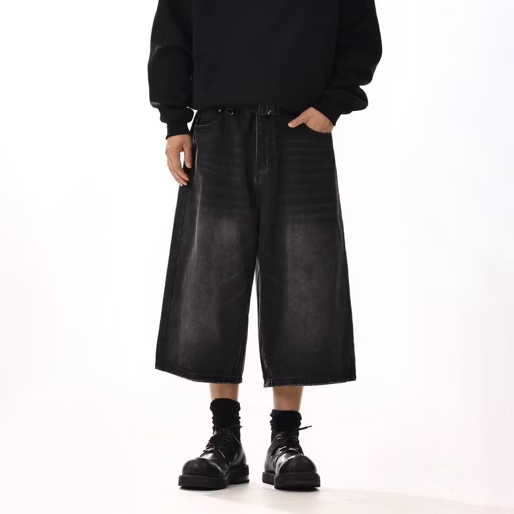 Celana Baggy Short Jeans Unisex Pria Wanita Celana Gombrong 7/8 Black Retro