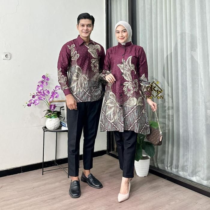 Atasan Baju Batik Couple Kemeja Dan Tunik Pria Wanita Batik Kerja - KEMEJA NAMIRA BURGUNDI M