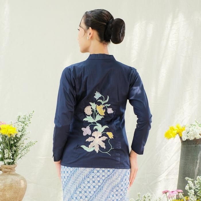 Kebaya kartini encim bordir malia lengan panjang meradelima katun jepang biru navy - XS