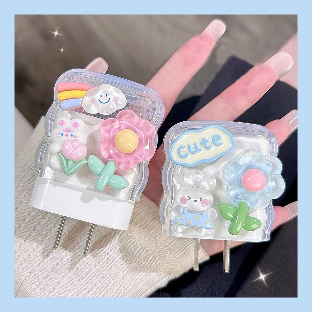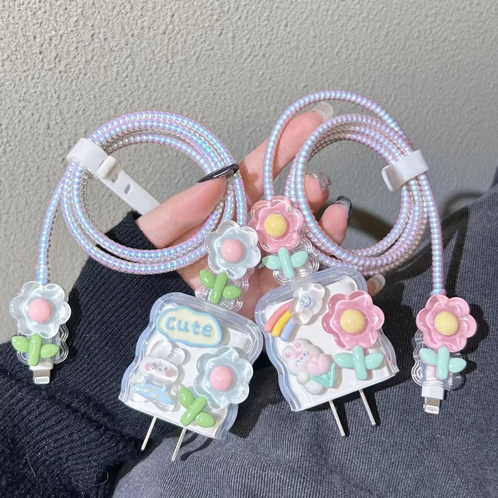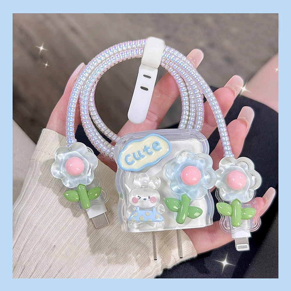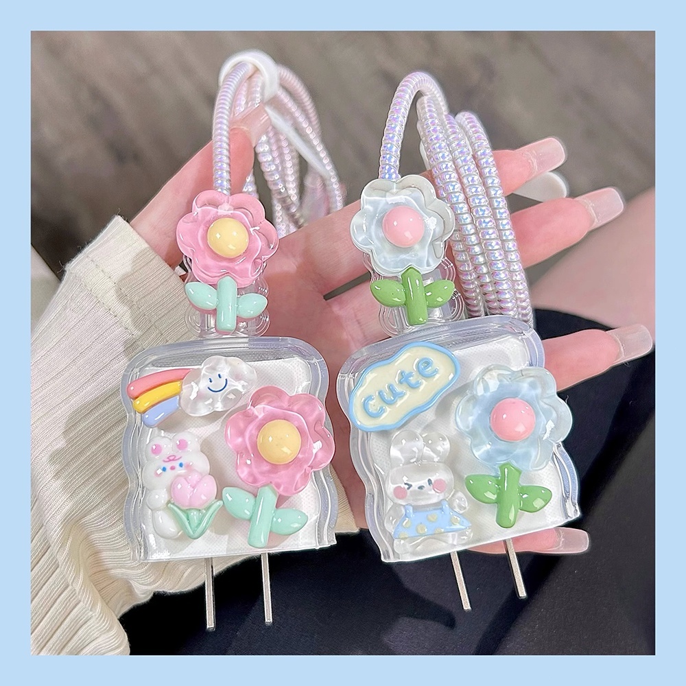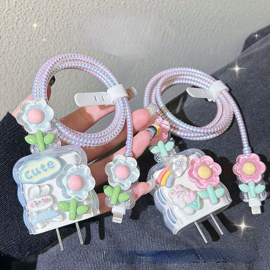 Pelindung Charger Iphone dengan Pola Bunga dan Beruang Pelindung Kabel & Kepala Charger Iphone 18w&20w Pelindung Adaptor