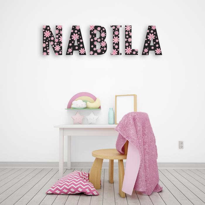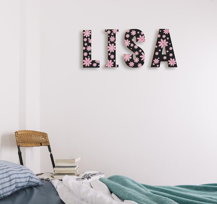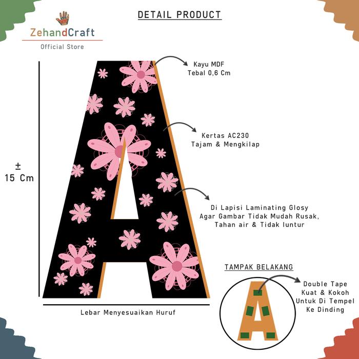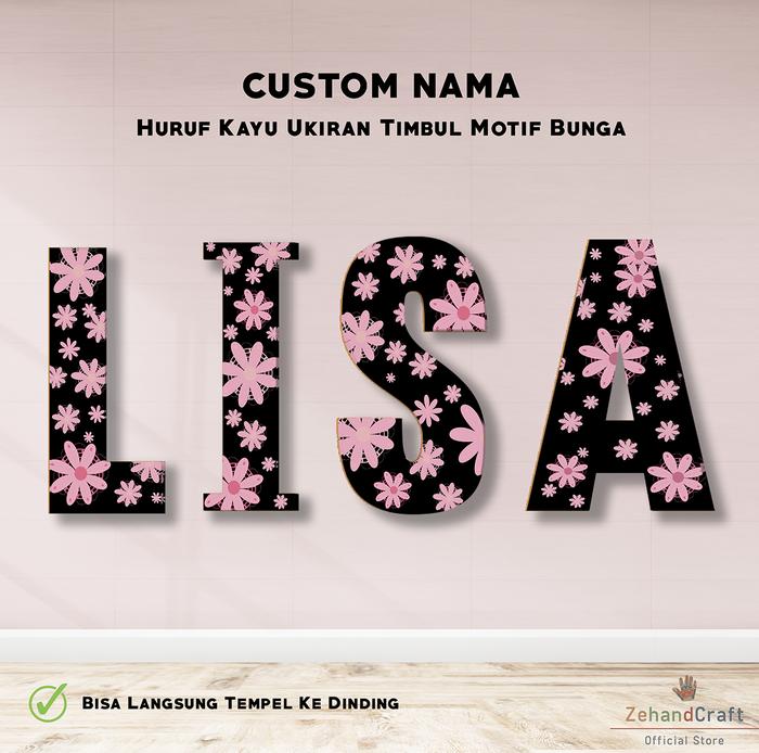 Zehandcraft - Pajangan Dinding Huruf Kayu Ukiran Motif Bunga Warna Blackpink - A