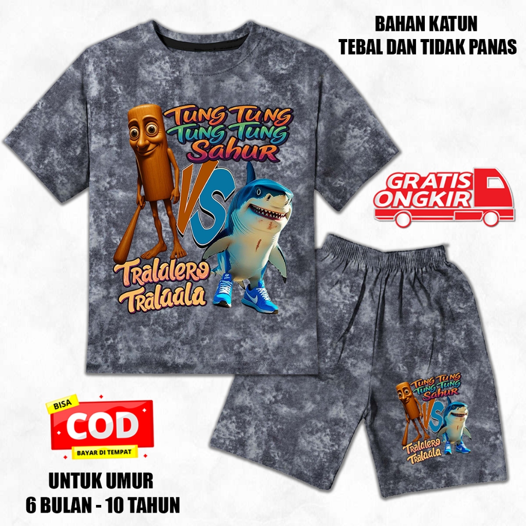 Setelan Anak Lengan Pendek Umur 6 Bulan - 10 Tahun Motif Tung Tung Sahur Bahan Katun Premium Sablon DTF Jeans