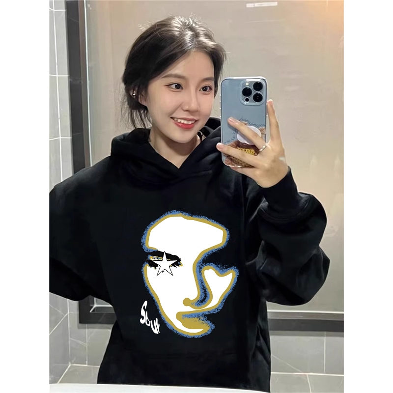 QLIOOO Sweatshirts dan Hoodies Oversize Potret Buram Printing Style / Hoodies Hitam/Baju Wanita/Switer Wanita/Switer /sw