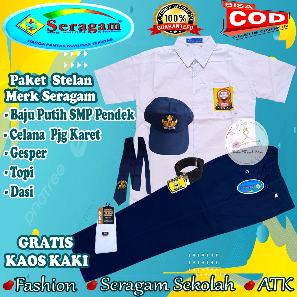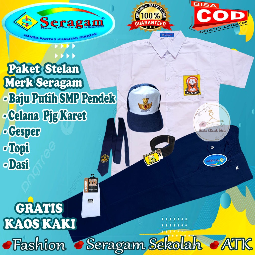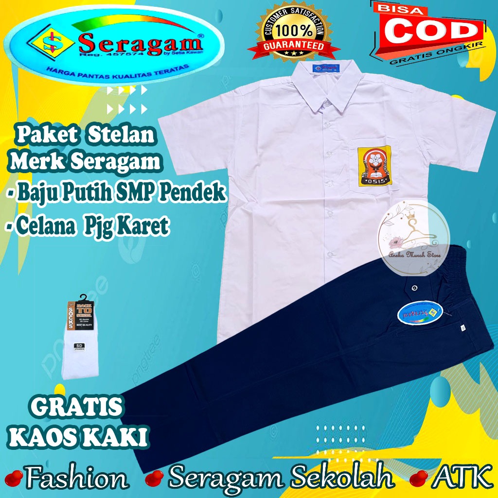 Stelan Baju SMP Lengan Pendek Celana Panjang Pinggang Karet Merk Seragam