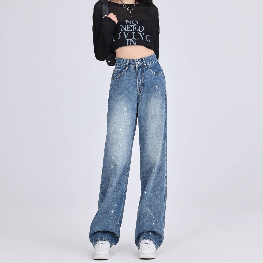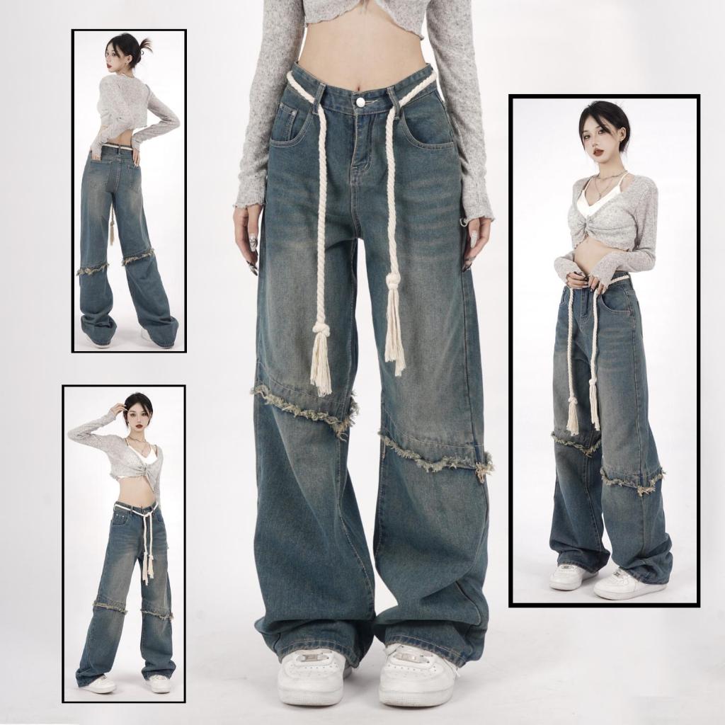Keygirl New Biru retro celana jeans panjang wanita high waist loose pants premium celana jeans kulot Korea Style wanita JUMBO kekinian