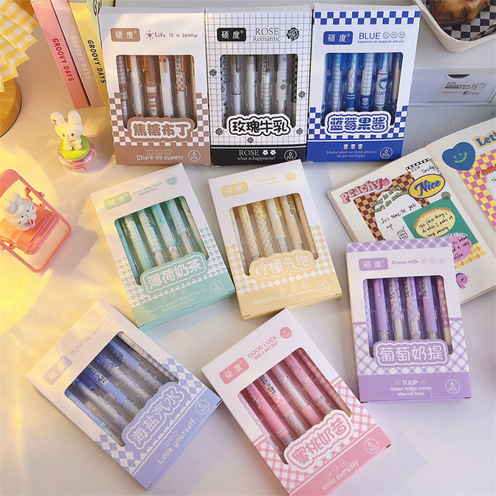 Alat Tulis Pena ST Set 6IN1 Motif Bunga 0.5MM / Retractable Pen Karakter Set / Perlengkapan Anak Sekolah Pulpen Cetek Import Tulis Terang A69