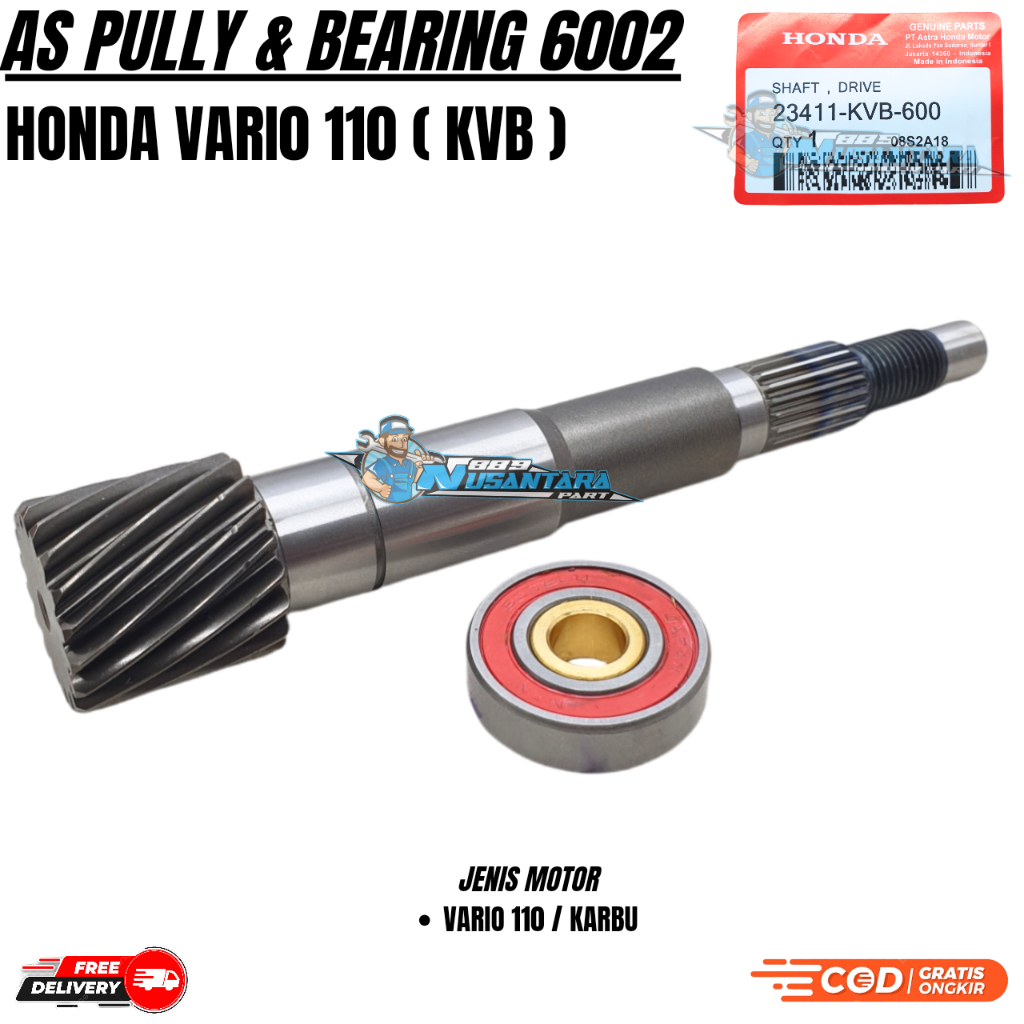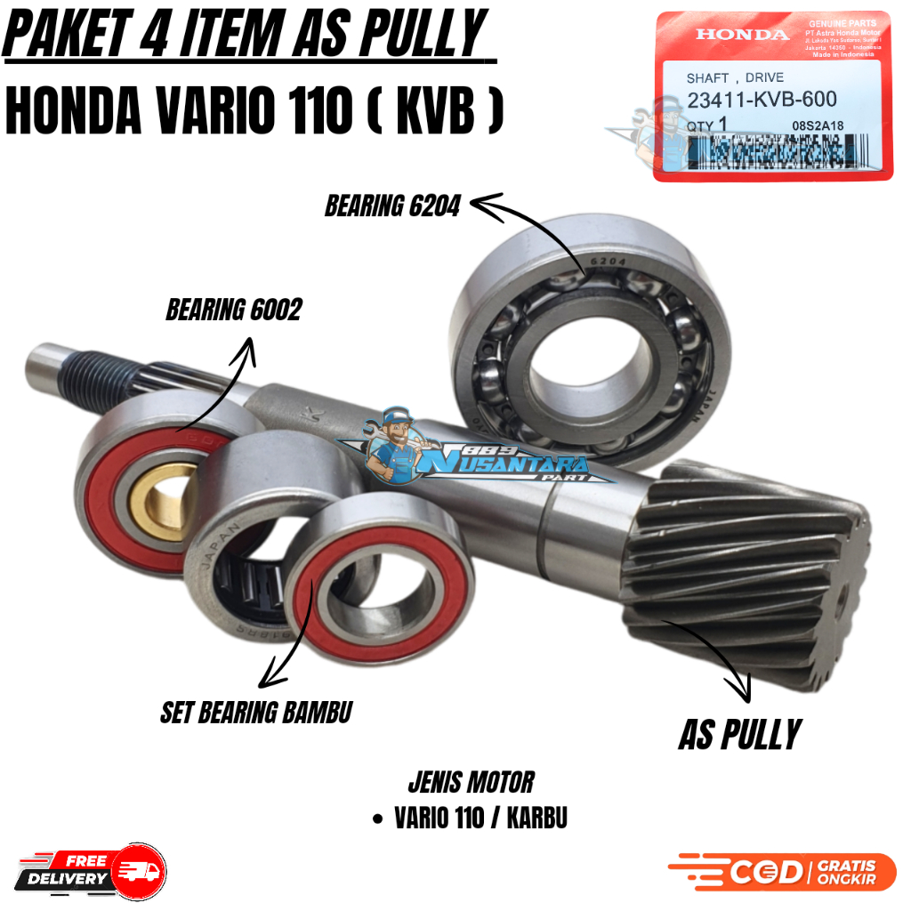GERATIS ONGKIR PAKET 4ITEM KVB AS PULLY VARO 110 + LAHER 6002 KUNINGAN + BEARING PULI + LAHAR 6204 VARIO KARBU / VARIO C