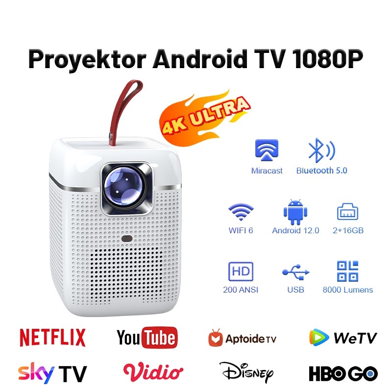 Proyektor Mini 1080P 8000 Lumen Smart Projector Android Tv Layar Tancap 9.0 Ram 2G/16G Infocus Murah Portable Untuk Hp