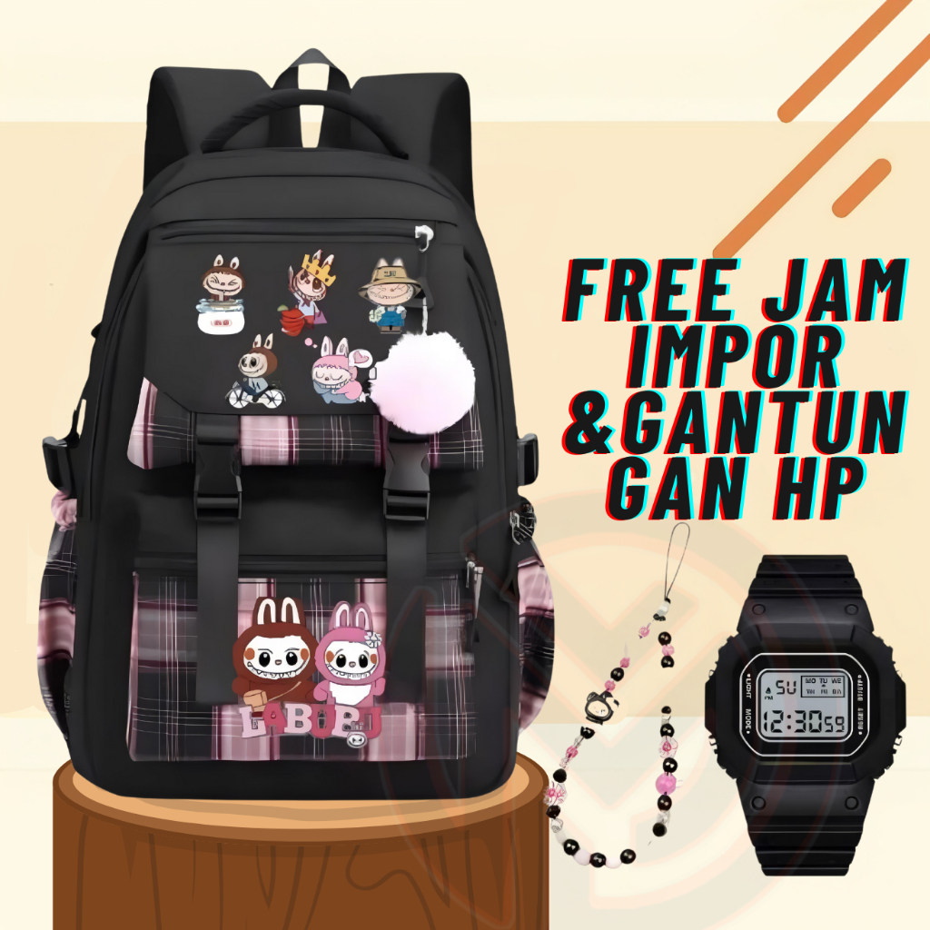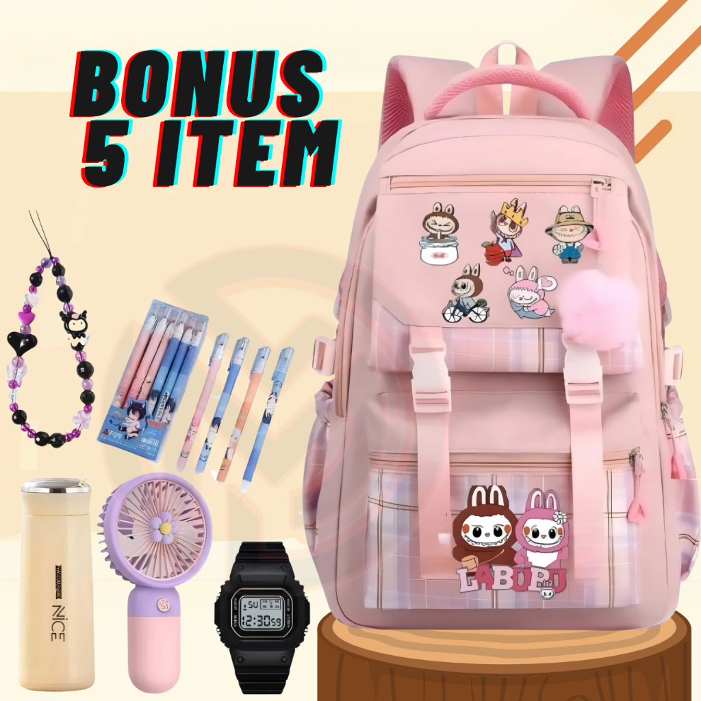 Tas Ransel Anak Perempuan LABUBU Bags Tas Sekolah Anak SD&SMP Free Botol Minum Jam Impor kipas mini ,4pena gantungan hp