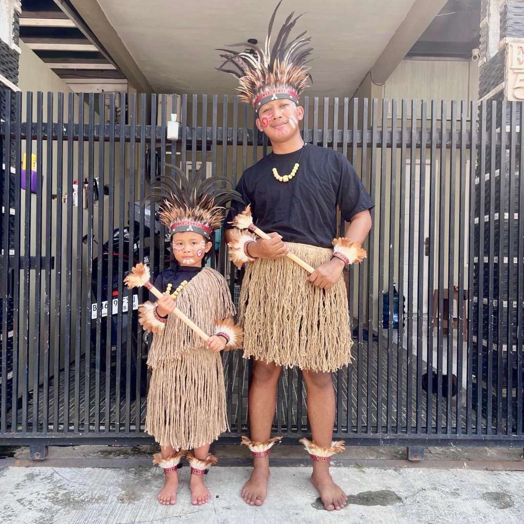 Acc tangan bulu, Rumbai dada anak, Topi anak & dws, Acc kaki bulu, Rok goni S, Rumbai dada dws, Rok goni M, Tongkat, Mahkota anak & dws, Kalung