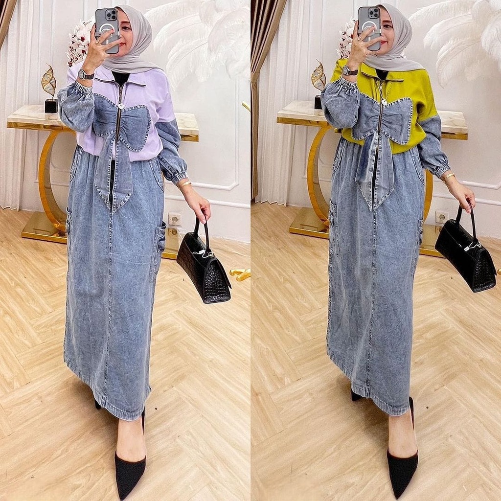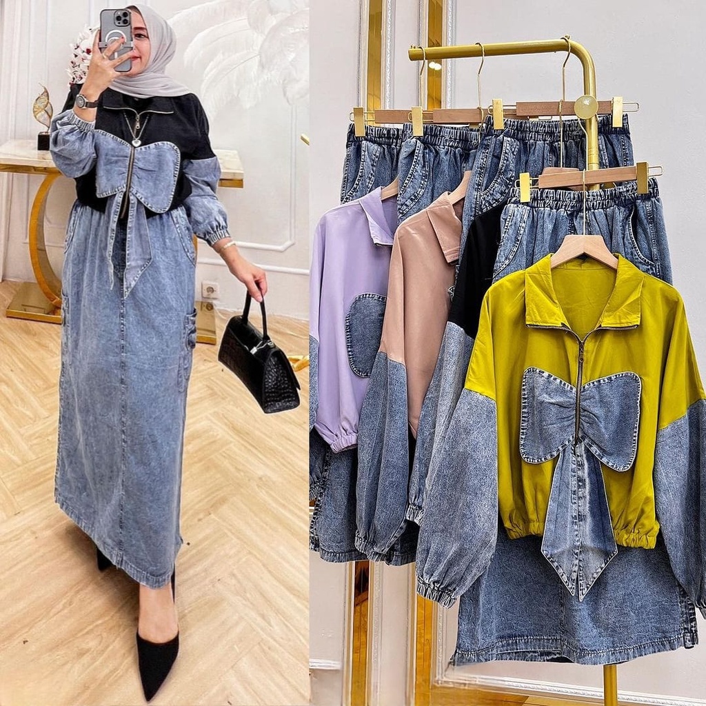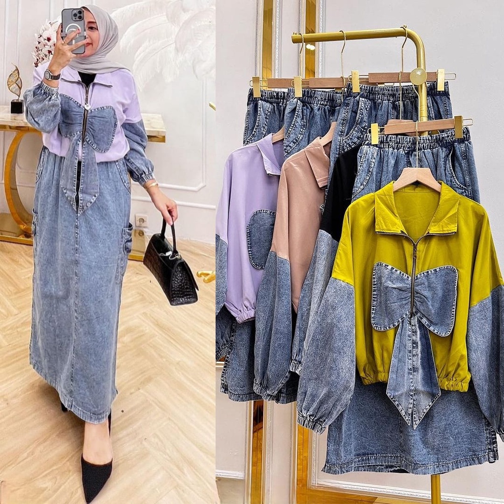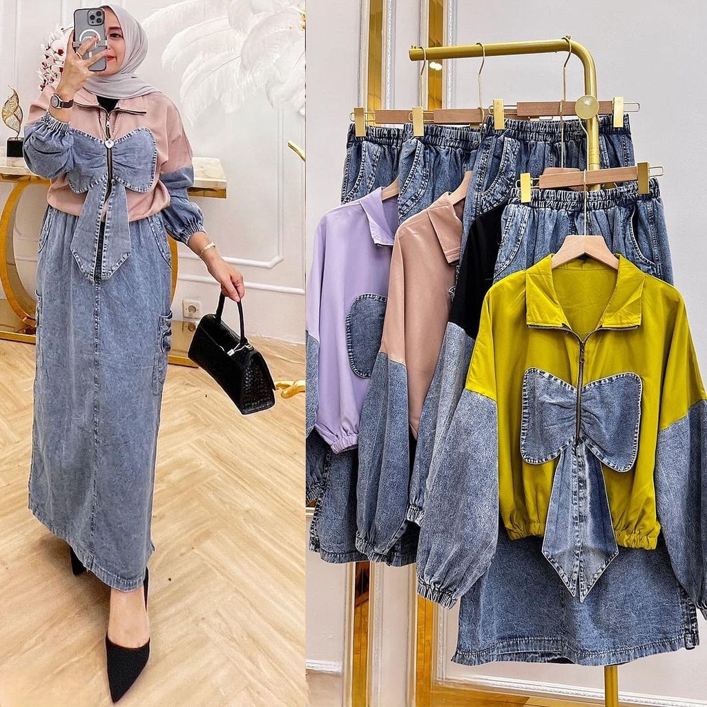 One Set - Vallina Outfit - Sherina One Set Skirt Ribbon Ziper Jeans Top Toyobo Baju Setelan Rok Wanita Muslim Modern Kek