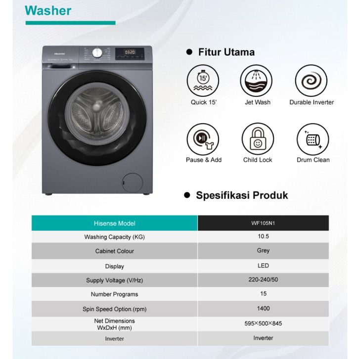 HISENSE MESIN CUCI INVERTER FRONT LOADING 10.5 KG /9rEY WF-105N1 KHUSUS MAKASSAR