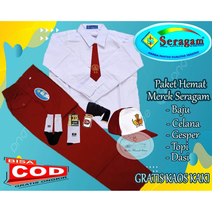 Promo Setelan Paket Hemat Seragam Sekolah SD Lengan Panjang Polosan + BED BORDIR Celana Panjang