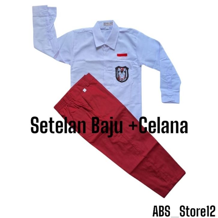 Promo Setelan Super Lengkap Seragam Sekolah SD BAJU PUTIH PANJANG CELANA MERAH PANJANG COWOK New