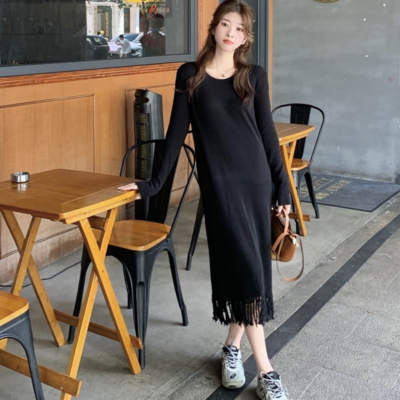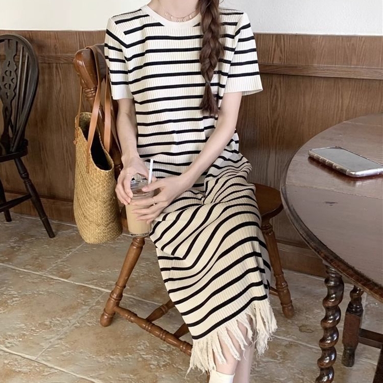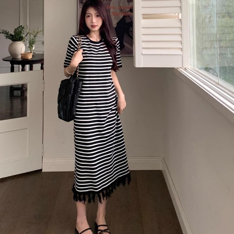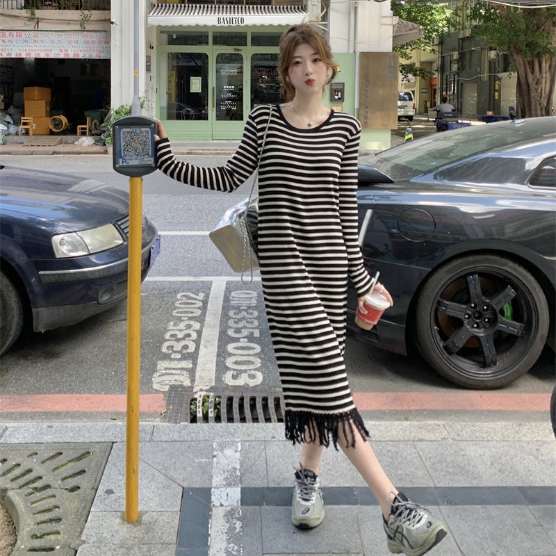 Korea rajut maxi dress gaun panjang bergaris dres wanita
