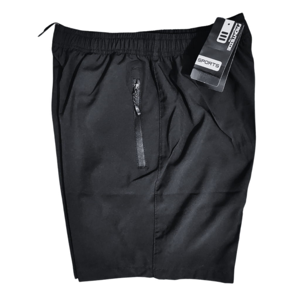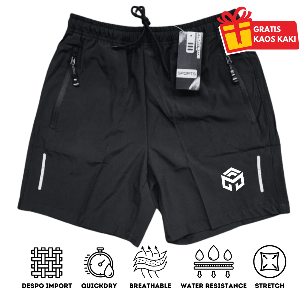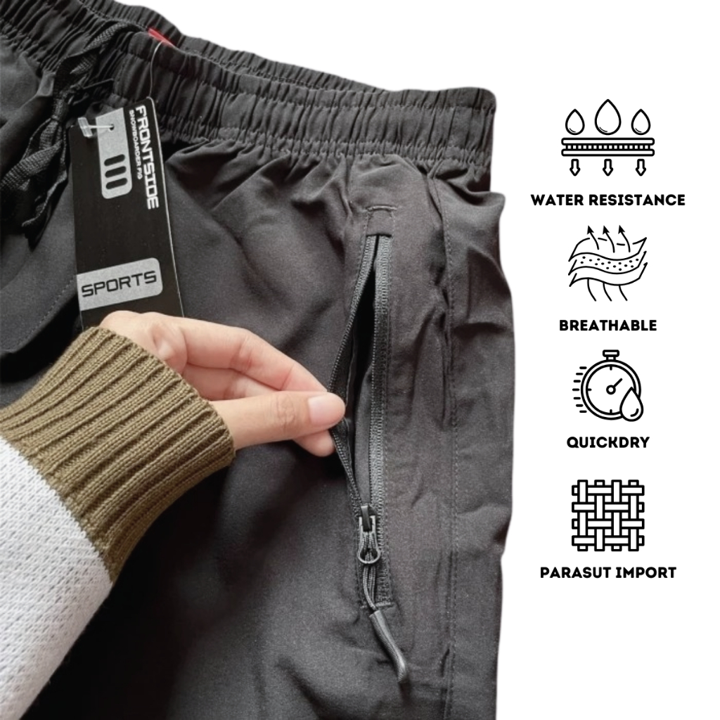 Celana Pendek Parasut Olahraga Saku Resleting Pria Wanita Running Santai Jumbo Polos Hitam