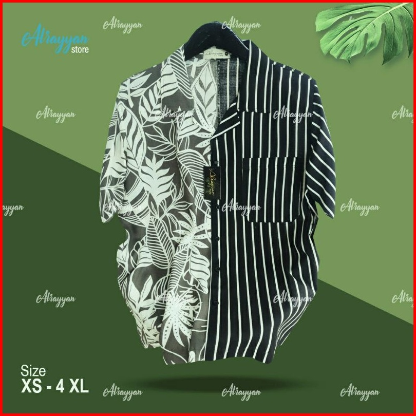 Alrayyan Store - Kemeja Daily Pantai Full Print Lengan Pendek Two Tone Salur Dark Green Floral Pria Wanita Kemeja Hawali
