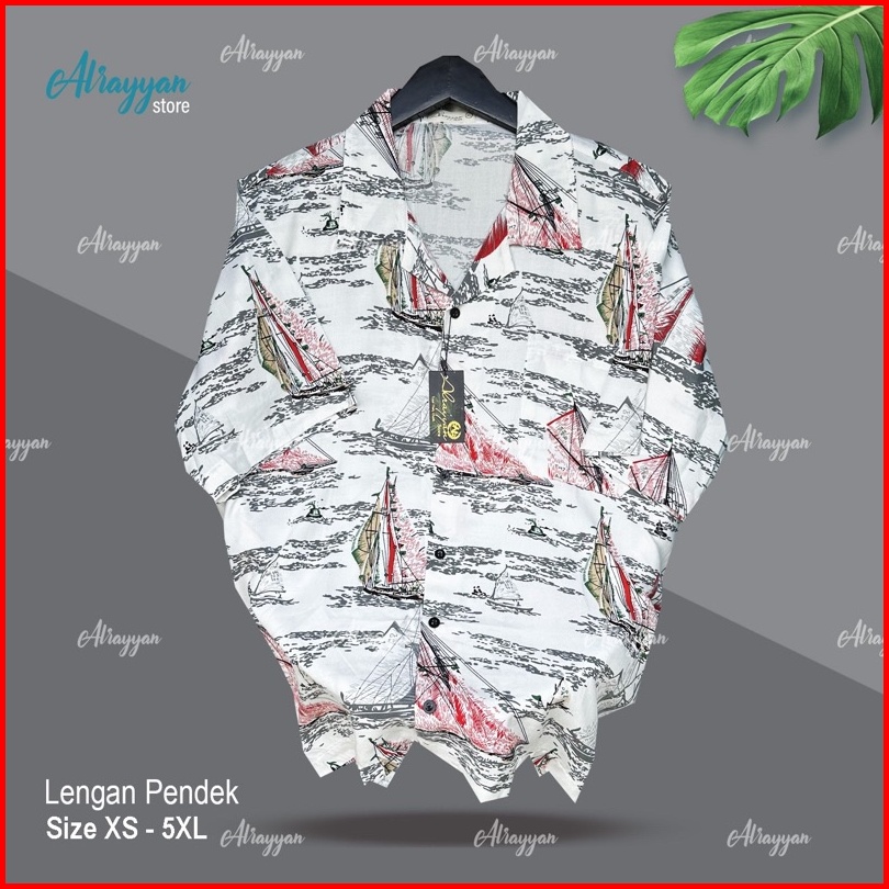 Alrayyan Store - Kemeja Hawaii Motif Perahu Putih Abu Lengan Pendek Pria Wanita Baju Motif Full Print Jumbo Unisex