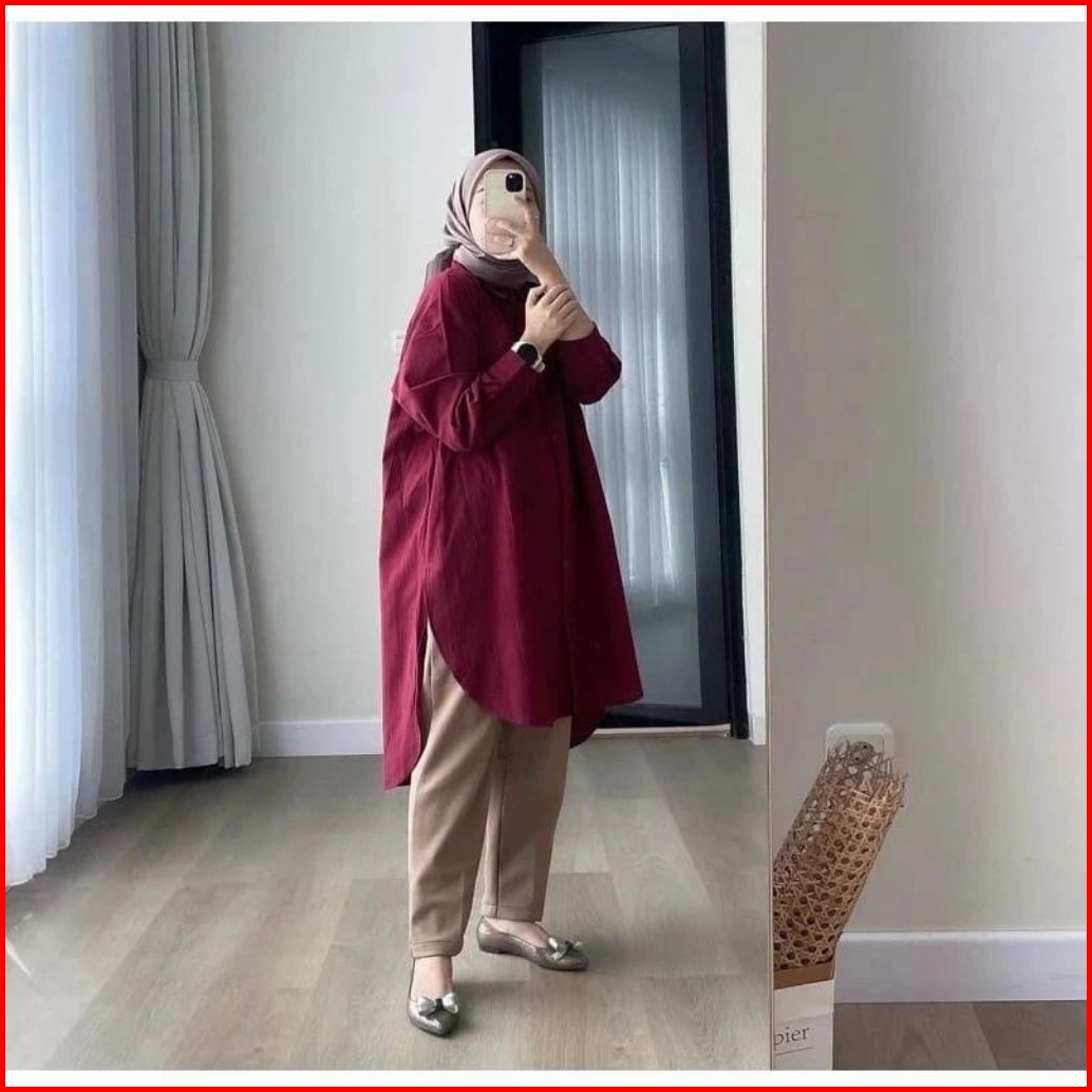 Kemeja Long Tunik Katun Linen - Tunik Wanita Polos Standar Dan Jumbo Terbaru Kekinian Bahan Katun Linen Simpel Elegan Be