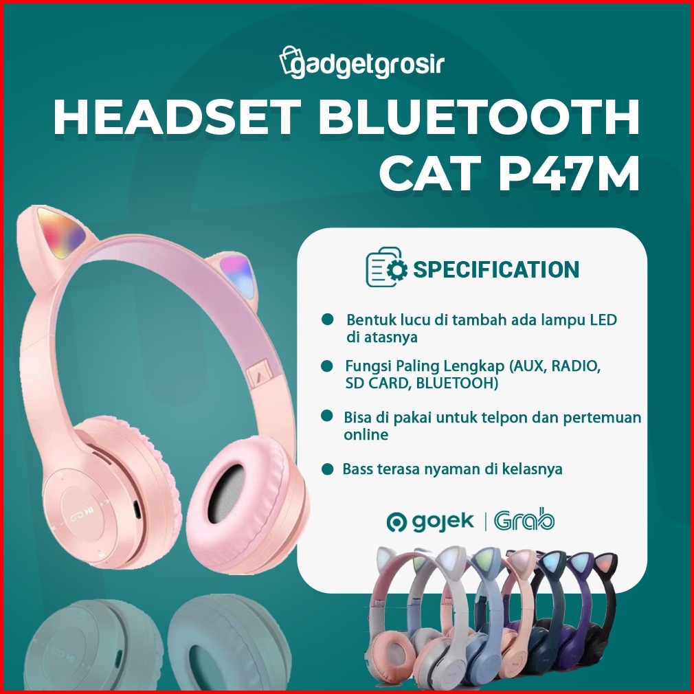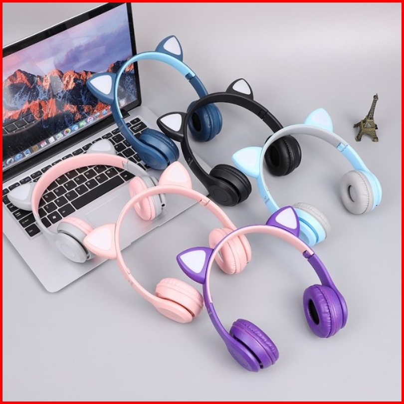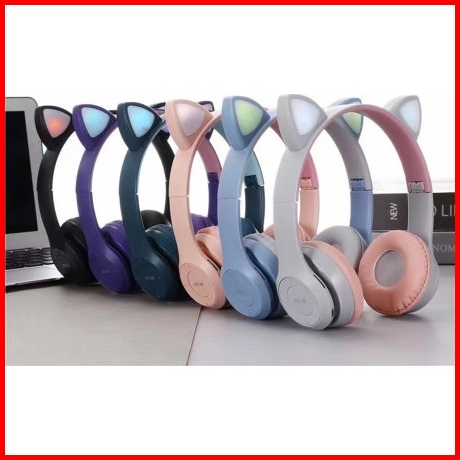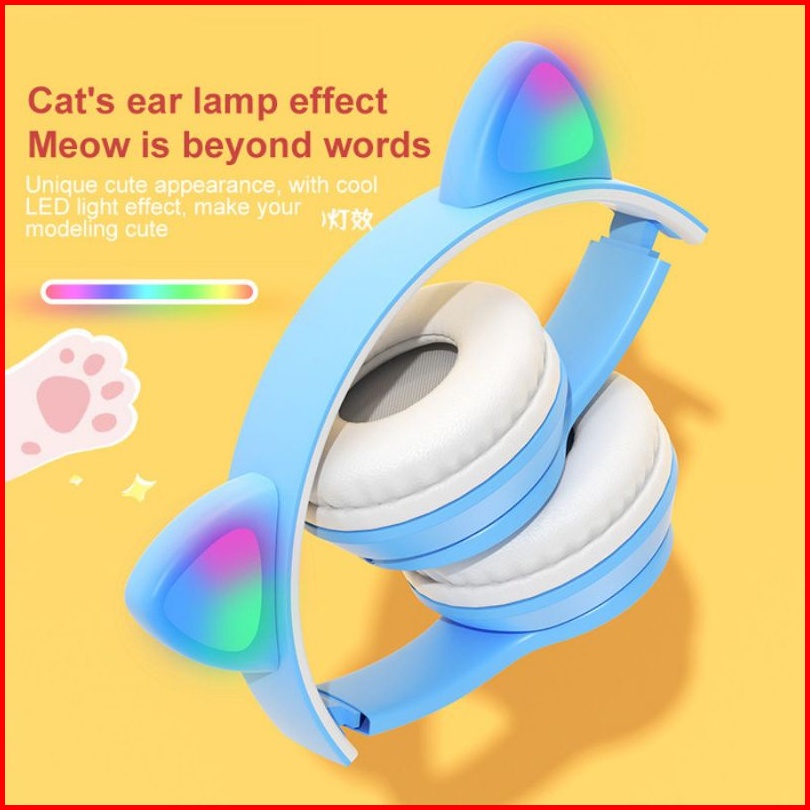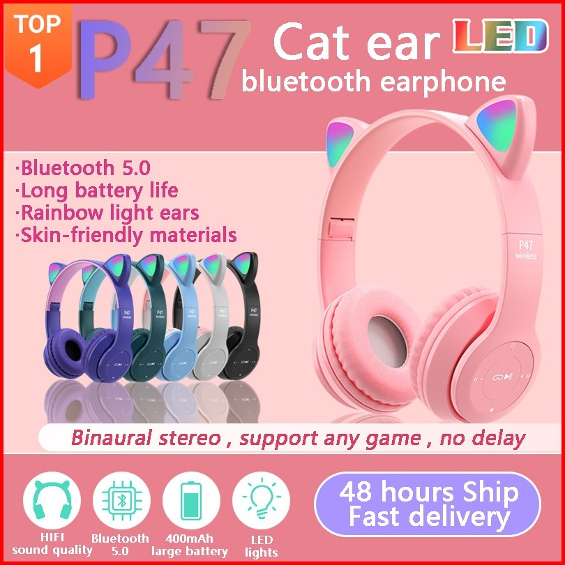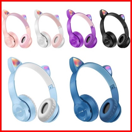 Headset Bluetooth Cat P47m Rgb Led Lamp Headphone Kucing Macaron Wireless Aux Micro Sd Bt V5.0
