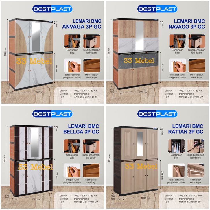 Lemari Pakaian Plastik Serbaguna BESTPLAST Olymplast Gantungan 2 Pintu/ 3 Pintu Cermin Pakai Kunci DISKON