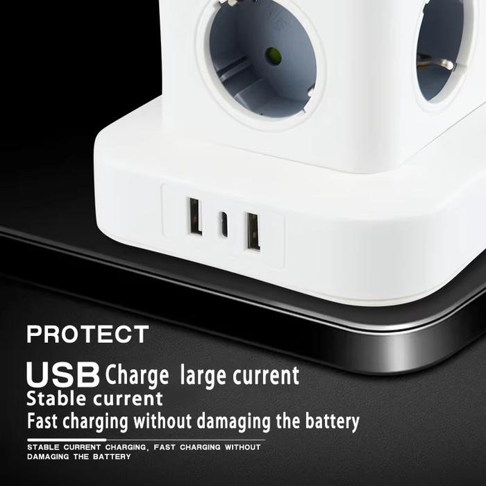 Stop Kontak Vertikal 1.8m - Multi Soket USB Proteksi Kelebihan Beban Steker EU & Kabel Ekstensi 12 Way 0utlets Socket