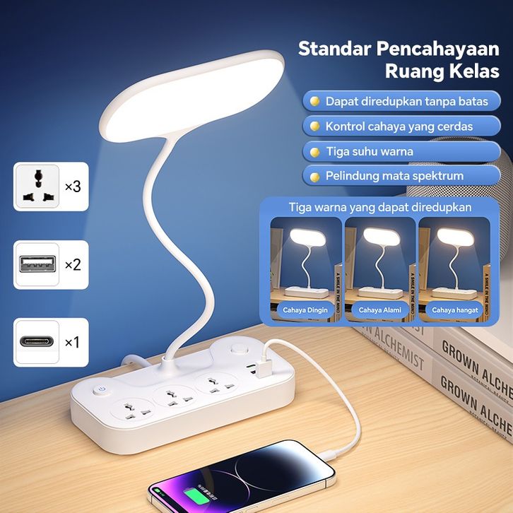 Lampu Meja 2-in-1 dengan Stopkontak Lampu Meja 3 Suhu Warna Dapat Disesuaikan LED Pelindung Mata / Belajar / Kerja