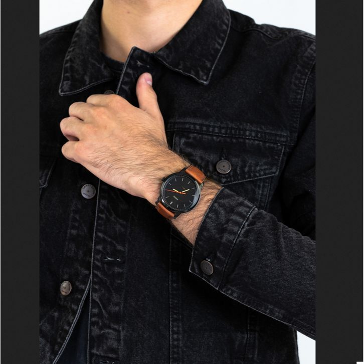 Jam Tangan Pria Elegan The Minimalist Three-Hand Black Dial Leather Brown Leather Strap 44mm