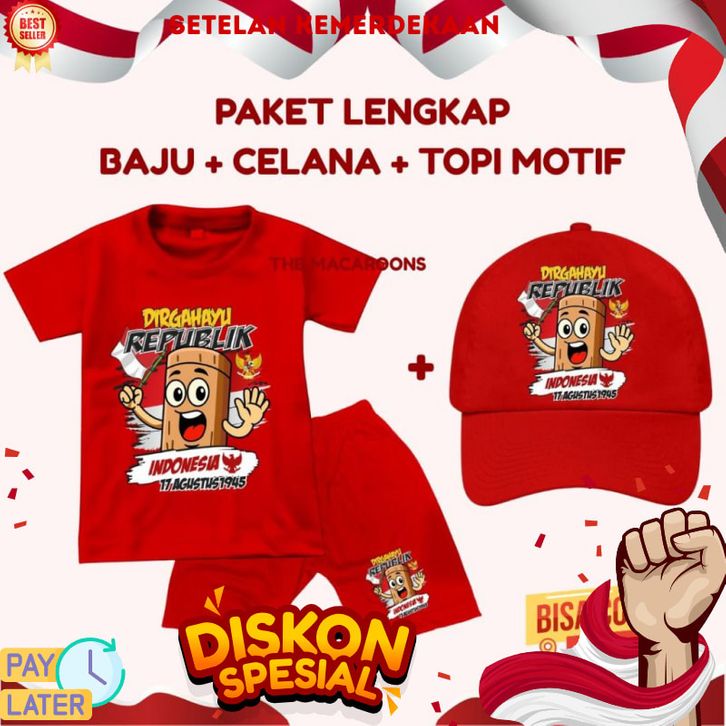 Setelan Baju Anak 17 Agustus [PAKET LENGKAP] Setelan Kaos + Topi Anak 17 Agustus Baju Celana Topi Kemerdekaan Acara