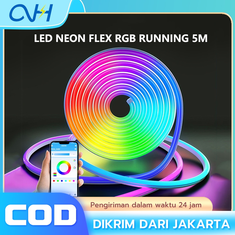 PAKET LED NEON FLEX RGB RUNNING 5M METER DC 12V/24V SENSOR SUARA APP CONTROL + ADAPTOR + REMOTE CONTROL LED