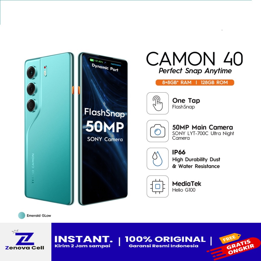 [Mall] [FLASHSNAP] TECNO CAMON 40 8+8GB*128 GB, 50MP Sony + 8MP Ultra Wide Camera, 32MP Front Camera, 120hz AMOLED, IP66