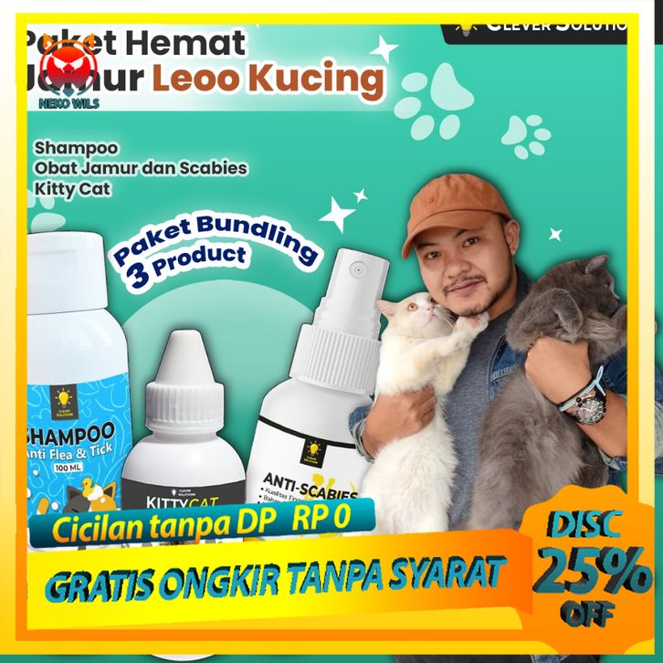 Clever Solutions - Paket Basmi Jamur Leoo Kucing - Shampoo Anti Flea & Tick + Kittycat + Obat Scabies (Produk Perawatan
