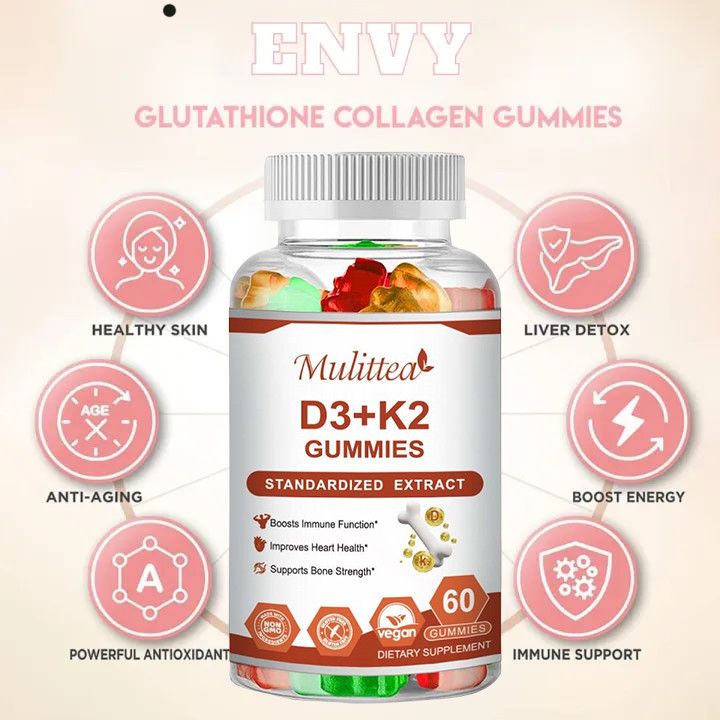 Mulittea Glutathione Collagen Glow Gummies Anti-Aging Whitening Skin Strawberry Flavor Vitamins Gummy 60pcs Permen Jeli